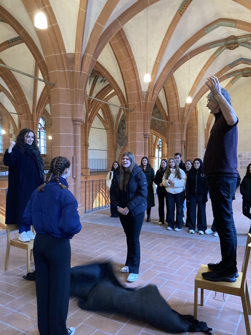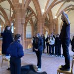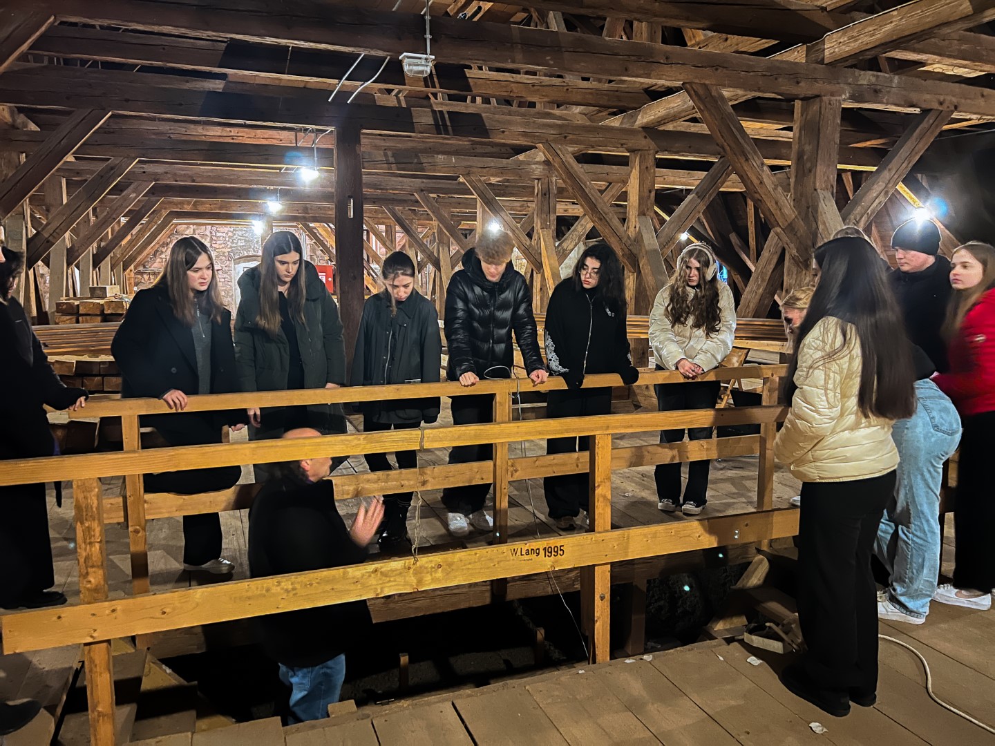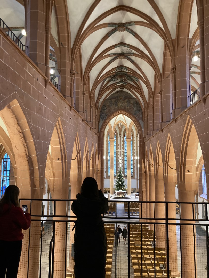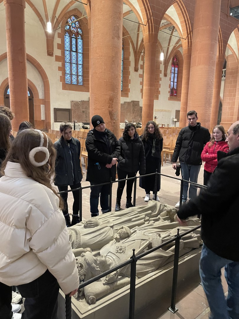 Im Anschluss an die kurze Stadtbesichtigung machte sich die Gruppe auf, um eine besondere Führung durch die bekannteste Kirche Heidelbergs zu erhalten: Gemeinsam mit Pfarrer Vincenzo Petracca erkundeten die Schülerinnen und Schüler die Heiliggeistkirche und durften auch den Dachstuhl und den Turm der Kirche erkunden. Der Pfarrer nahm sich hierbei viel Zeit für die Fragen der Jugendlichen und machte auch auf viele architektonische Besonderheiten in Kombination mit der Geschichte Heidelbergs aufmerksam.