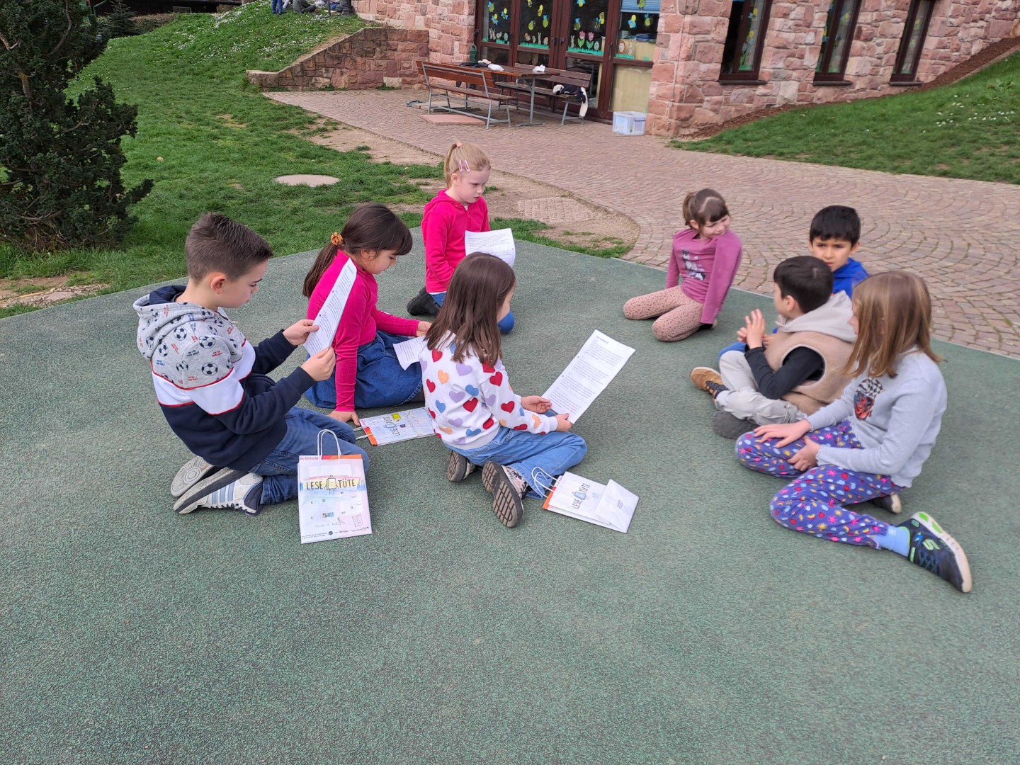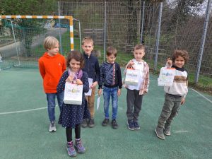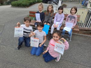 Pünktlich zu den Osterferien überreichten die Zweitklässler ihre selbst gestalteten Lesetüten, die von der Buchhandlung ‘Mäx und Moritz’ mit einem Erstlesebuch gefüllt wurden, an die Kinder der beiden ersten Klassen.