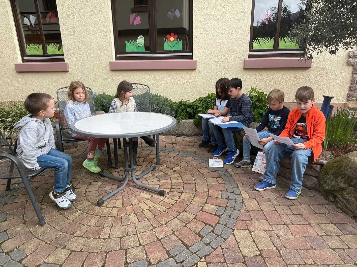 Dazu lasen sie in kleinen Gruppen den Erstklässlern die Geschichte ‘Das verlorene Ei’ vor. Gespannt lauschten die ‘Kleinen’ den ‘Großen’ und diese wiederum waren stolz ihr erlerntes Können zu zeigen.