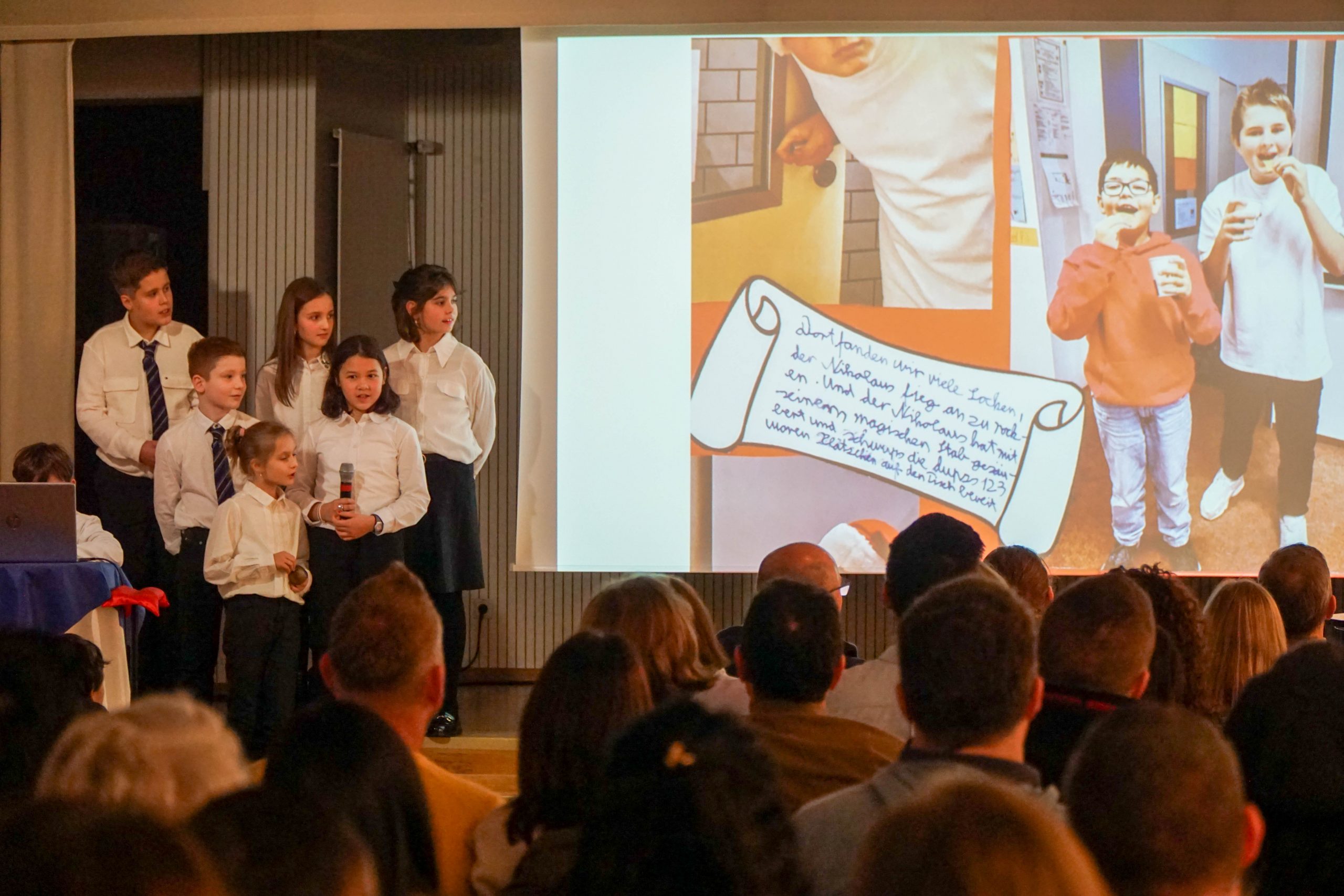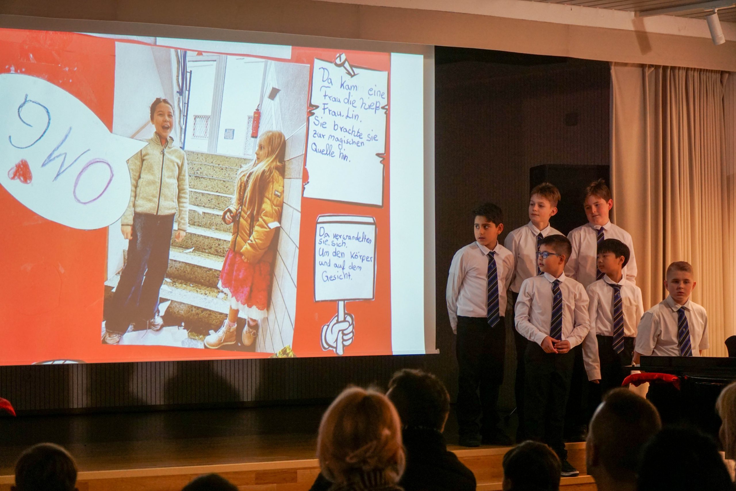 Da wurde im Vorfeld viel geübt und am Ende stand eine tolle und bunte Veranstaltung aller unserer fünften Klassen für die Eltern in der Aula. Nach der Begrüßung durch Schulleiter und Geschäftsführer Michael Büchler übernahmen die Kinder das Programm:
