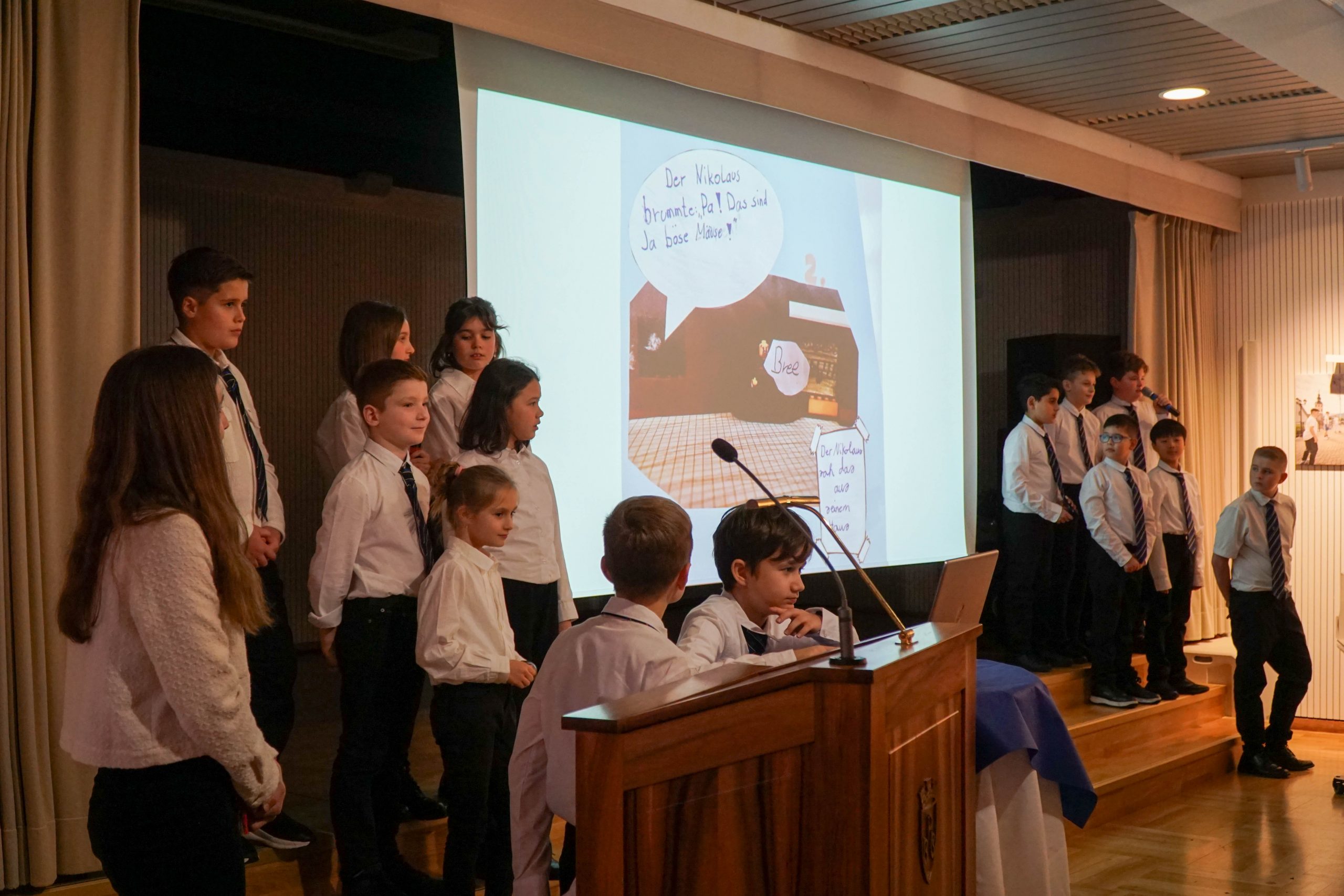 Mit Begrüßungen in verschiedenen Landessprachen ging es sowohl musikalisch als auch mit selbst gereimten Gedichten und Theaterstücken weiter, bis schließlich tatsächlich der Nikolaus mit seinem treuen Gehilfen Knecht Ruprecht kam.