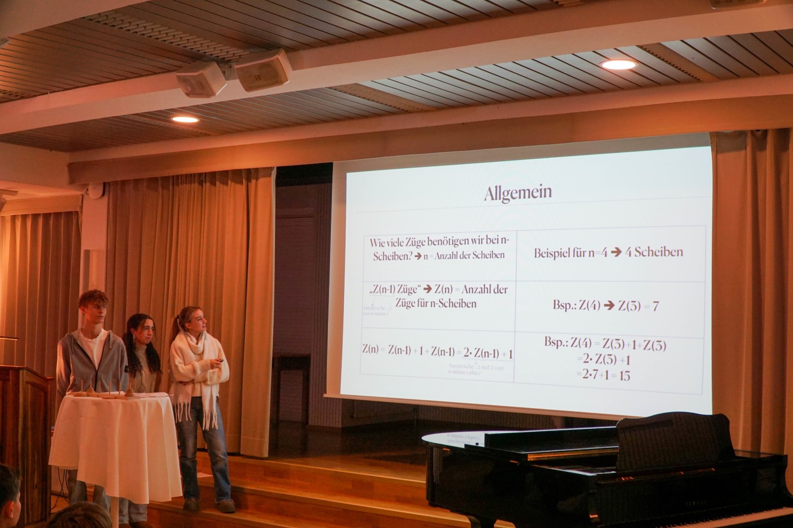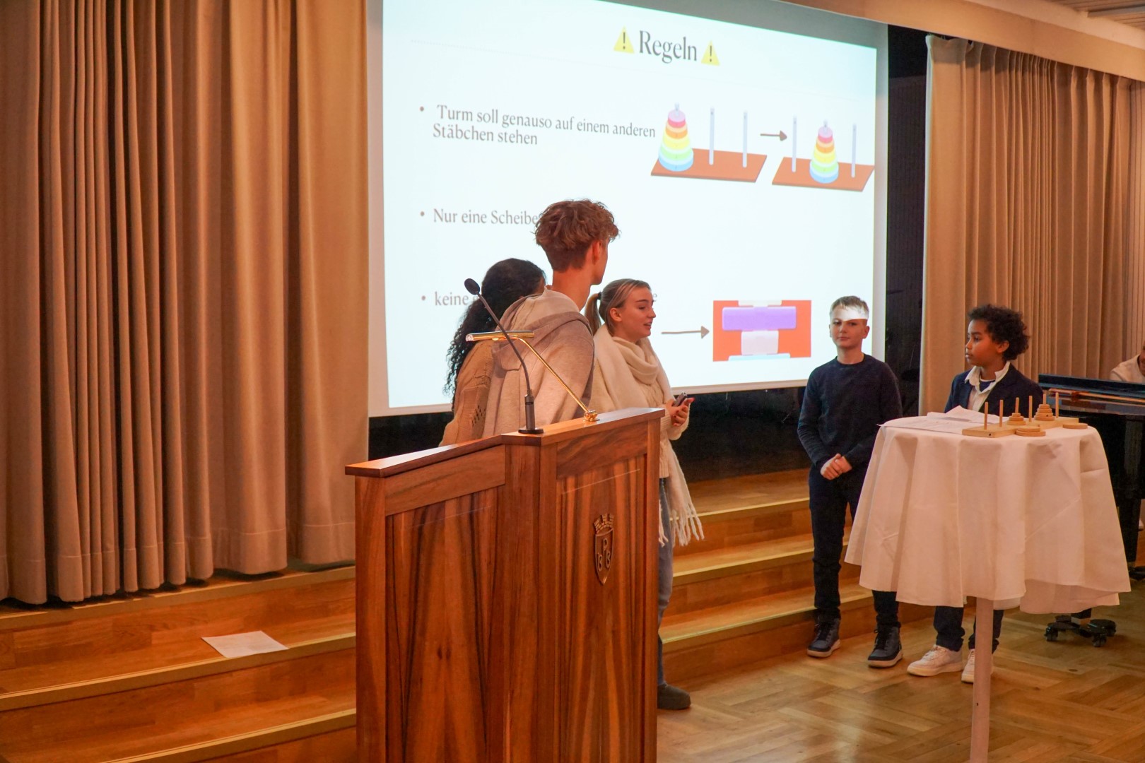 Die Aufgabe war Teil der diesjährigen Päda-Mathe-Olympiade für unsere Schülerinnen und Schüler aus den Klassen 5 bis 7. Für die Organisation verantwortlich war Mathematiklehrer Maximilian Mitzel mit seinen Leistungskursschülern der Jahrgangsstufe 1, die gemeinsam mit Slava und Sam aus der Klasse 5 das Rätsel in der Aula noch einmal vorstellten, die ersten Schritte erläuterten bis zum vollständigen Induktionsbeweis einer Formel, mit der man die minimale Anzahl der Züge bestimmen kann.