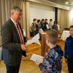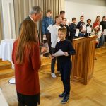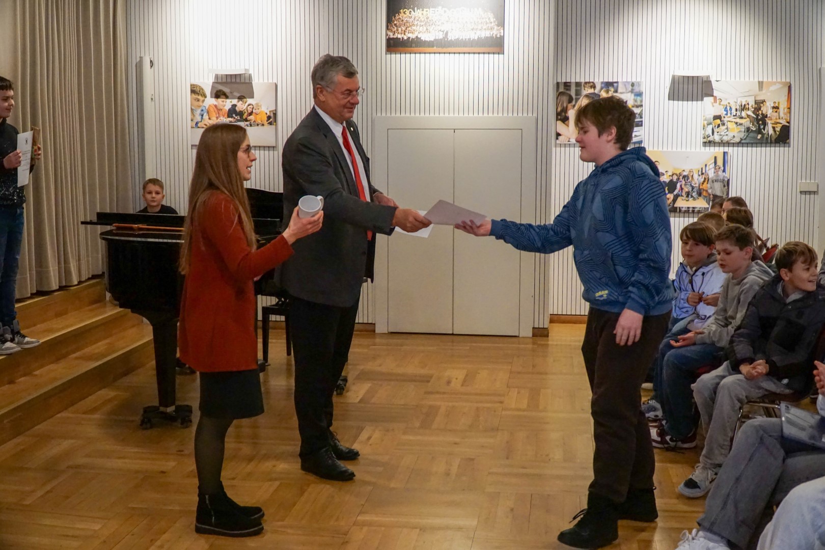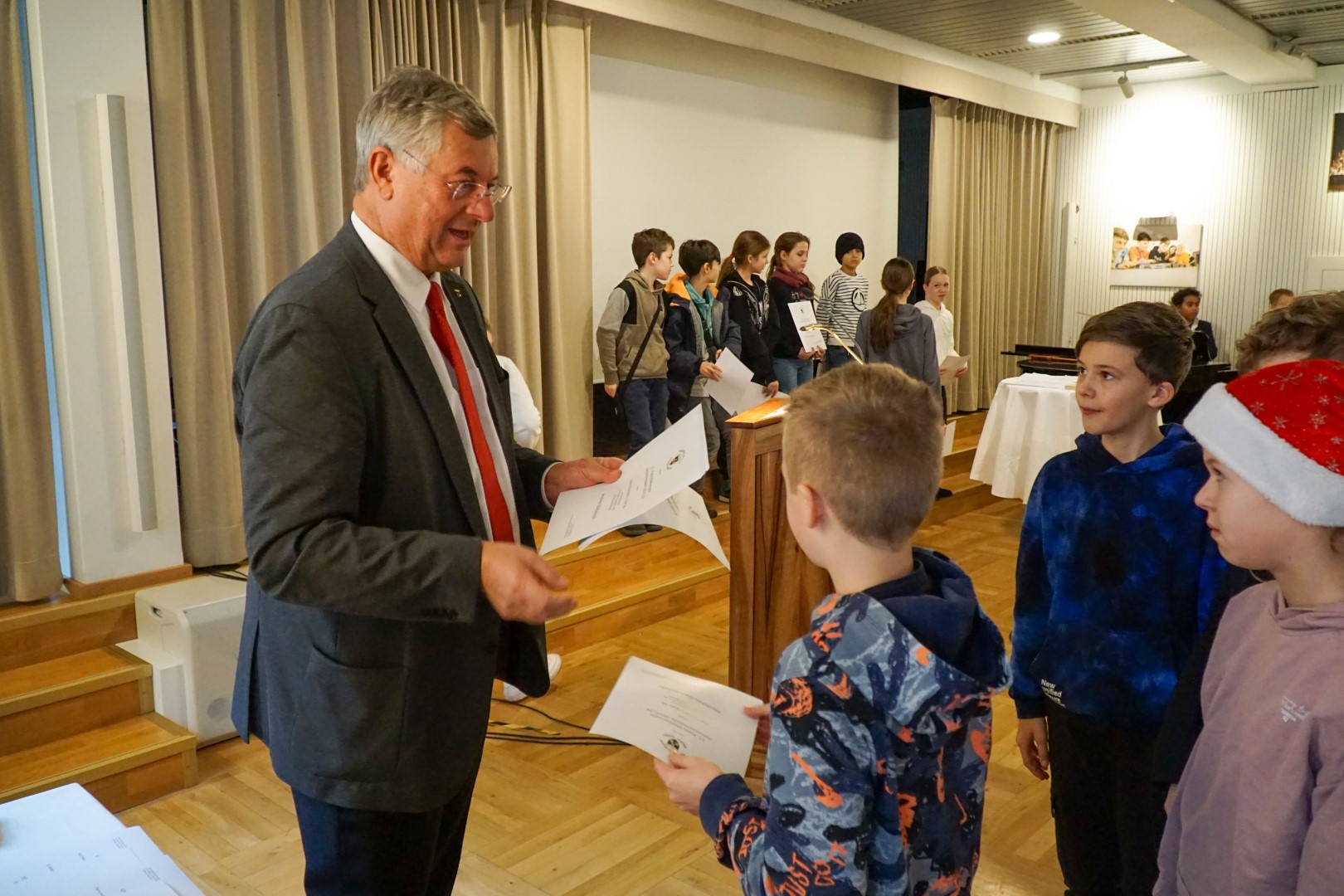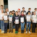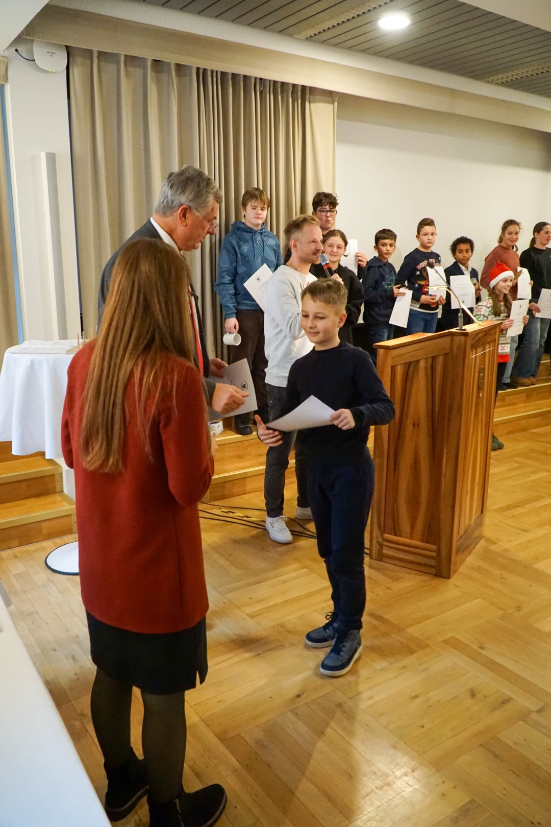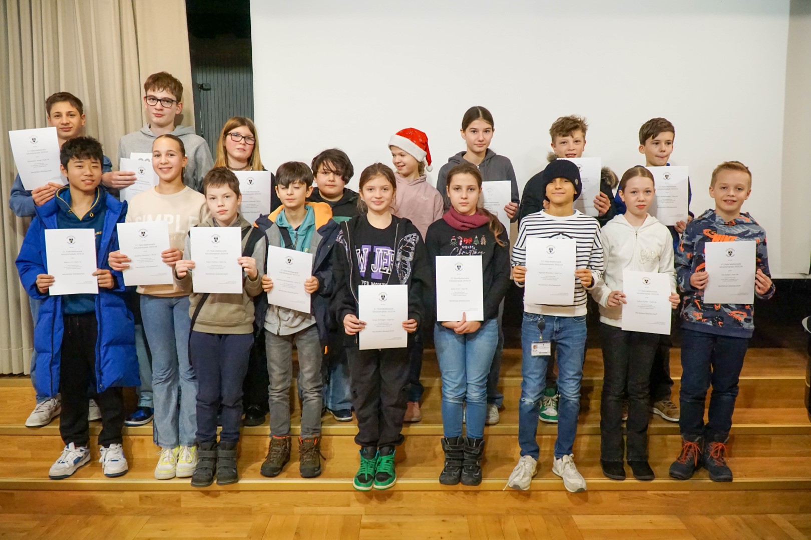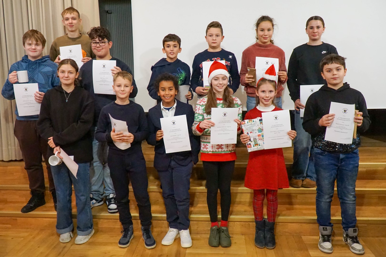 Insgesamt konnten rund 30 Preise vergeben werden, als Stufenbeste mit einem besonderen Lob konnten sich Sviatoslav Dovbniak aus der Klasse 5b , Grace Sefert auf der Klasse 6a und Artemiy Britvin aus der Klasse 7a über einen Gutschein für einen Ausflug ans Karlsruher KIT freuen.