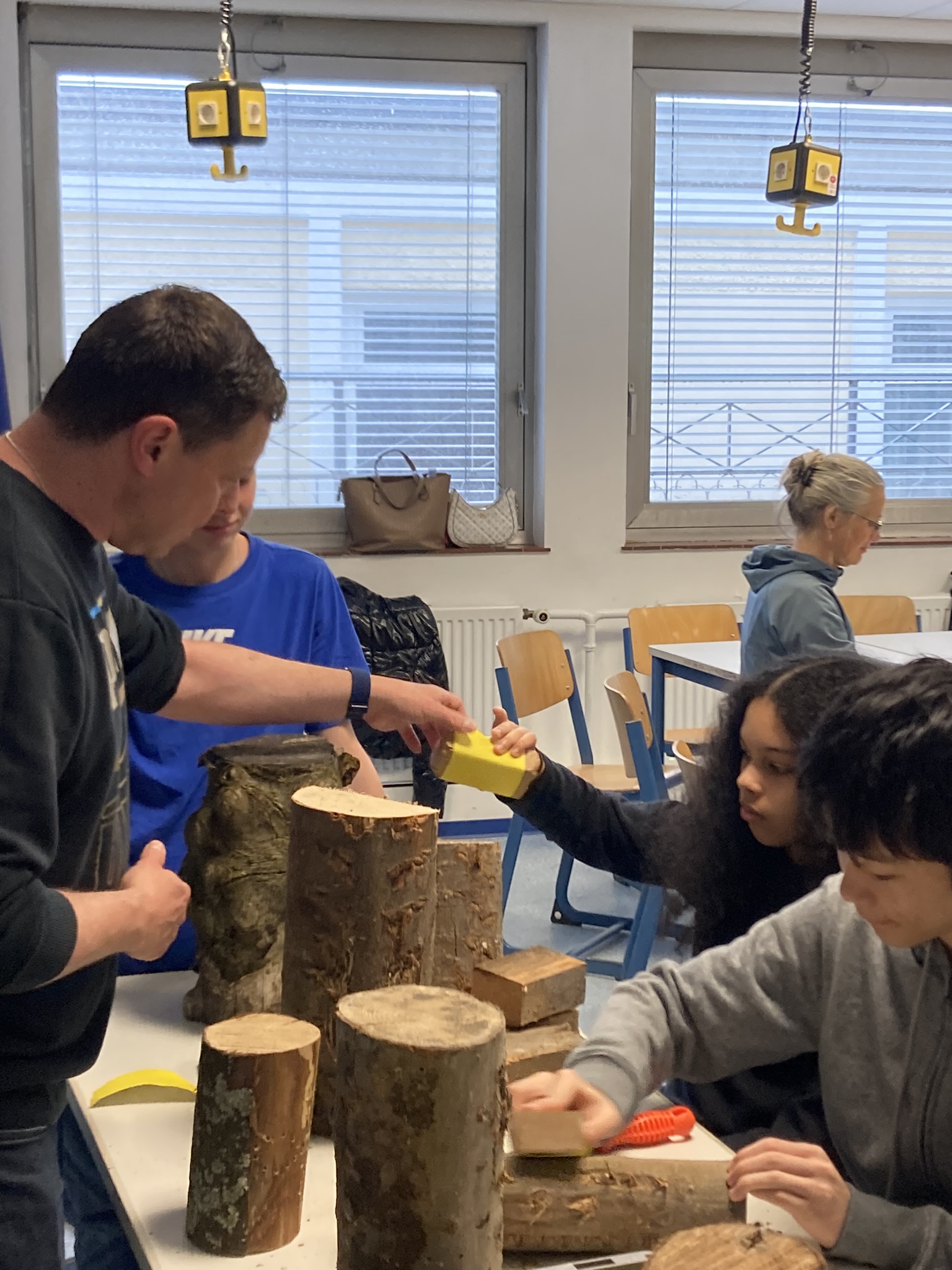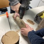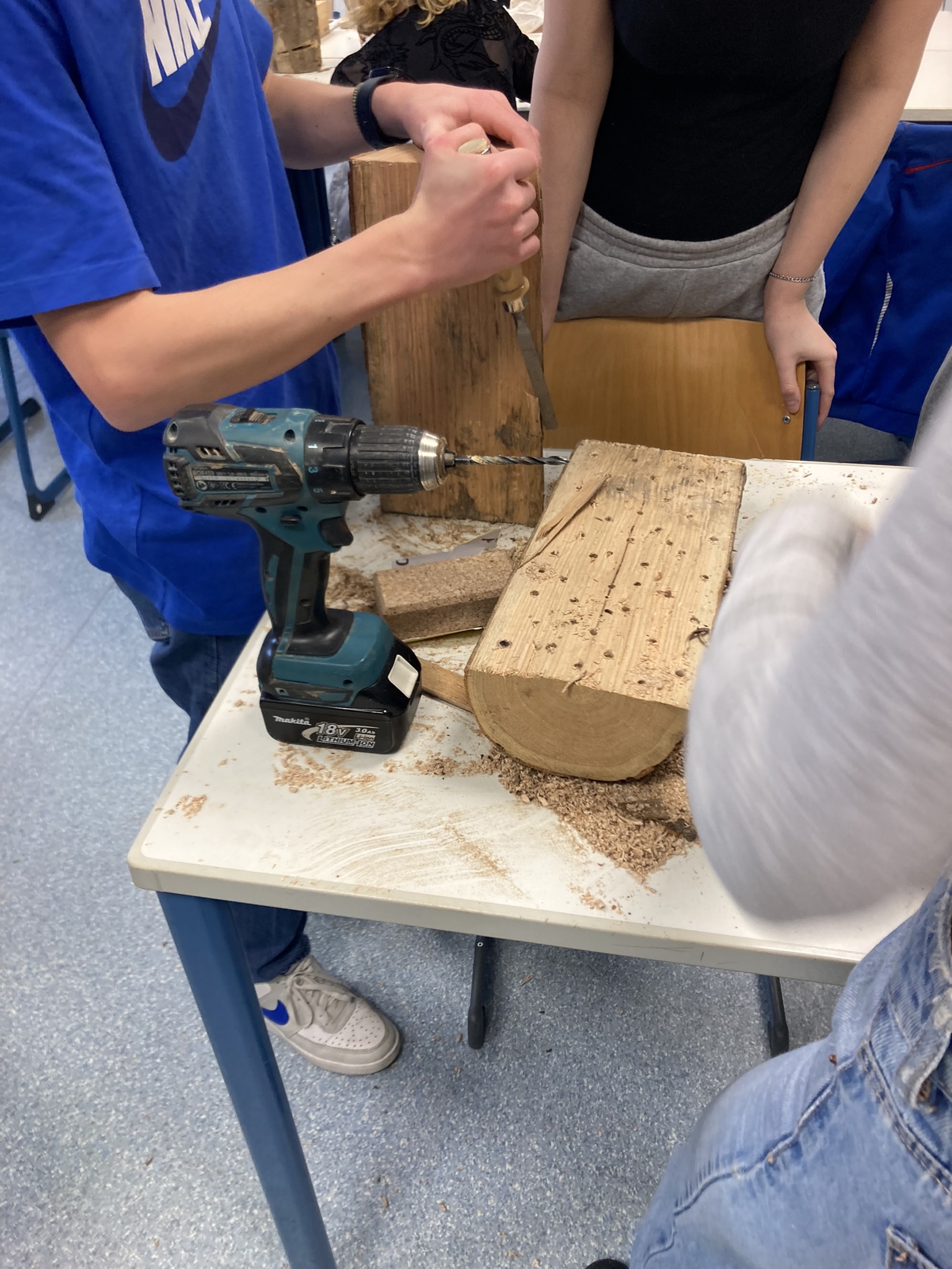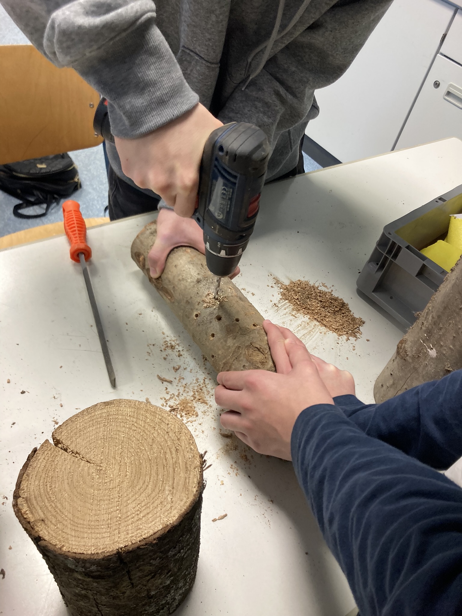 Aber – wenn wir nicht in den Wald können, kommt der Wald eben zu uns. Wir haben Buchenholz in den Biologie-Raum der Schule gebracht. Totholz bietet einen Lebensraum für eine Vielzahl von Organismen. Wir haben dem ganzen noch auf die Sprünge geholfen und Bruthöhlen für Wildbienen in die Holzstücke gebohrt.