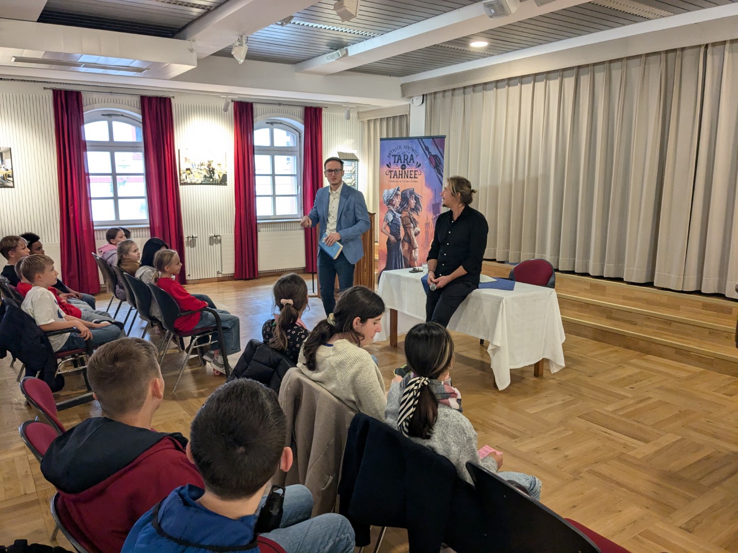 Erneut ließ bei der Veranstaltung unser Autor die Schülerinnen und Schüler mit drängenden Fragen zurück: Wie kann Tahnee ihren Vater vor dem Kopfgeldjäger retten und wer ist der Fremde, der bei der Ausfahrt von Tara in San Francisco so erschreckend in die Kutsche schaut? Dass das viele zum (Weiter-)Lesen verleitet hat, konnte man daran erkennen, dass am Ende zahlreiche Kinder ein Buch gekauft haben und es von Herrn Hertweck signieren ließen. Ein voller Erfolg für unsern Einsatz, das Lesen wieder attraktiv zu machen!