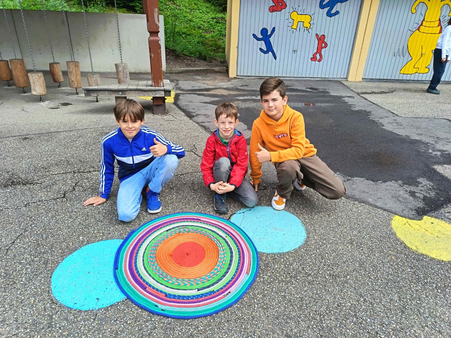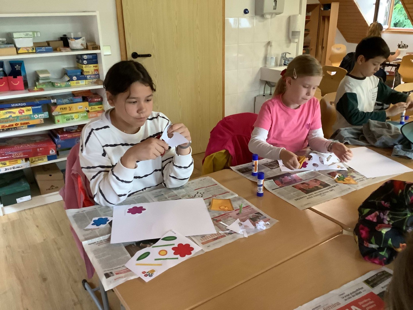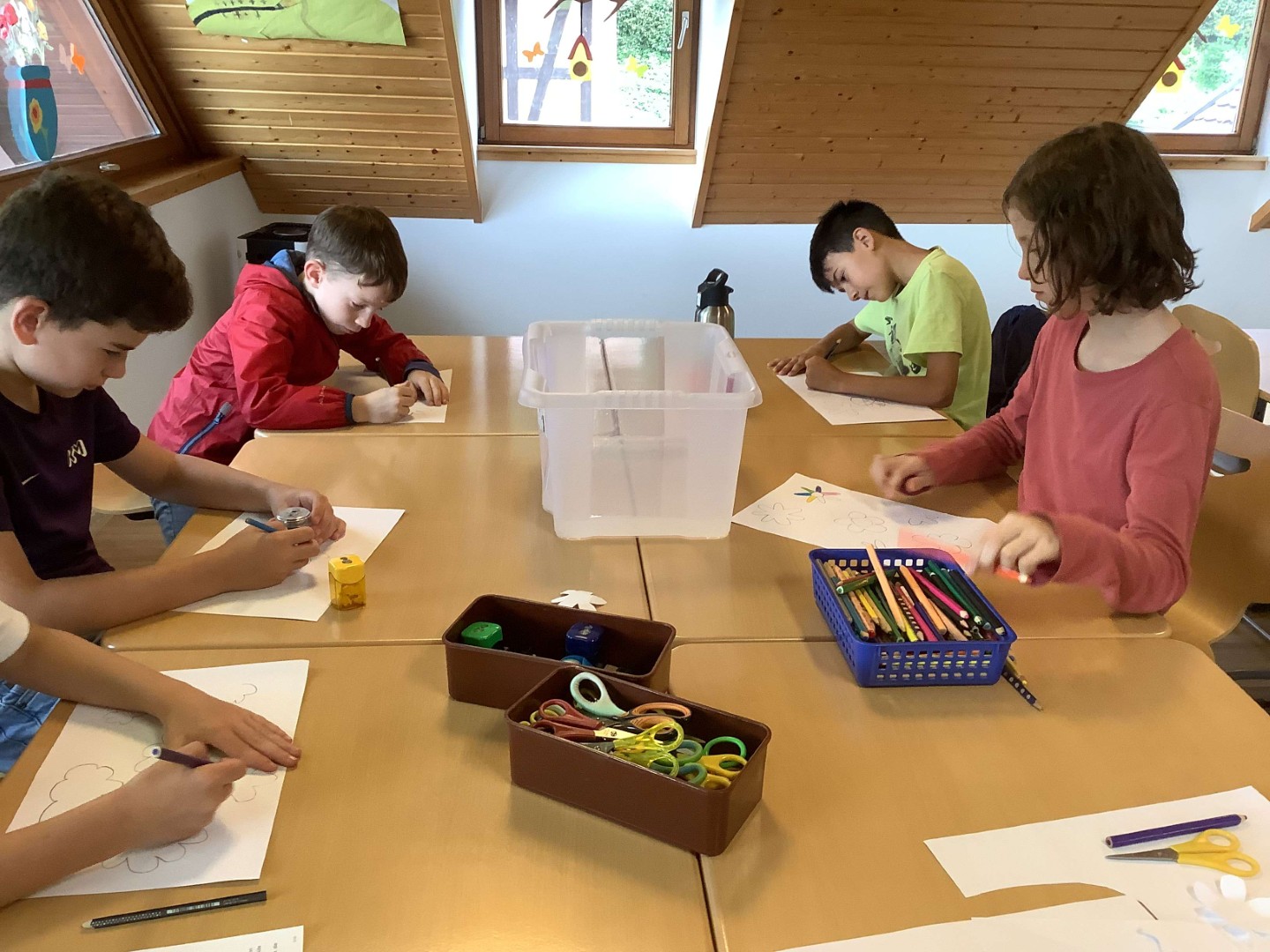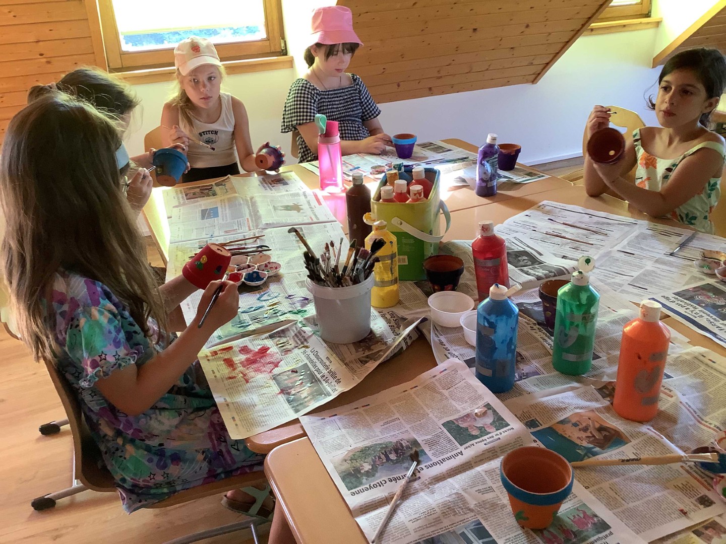 Kreativ sind wir auch geworden: Wir haben Wurfspiele gebastelt, Zauberblumen hergestellt, Window-Color-Bilder gemalt, Flechtbilder gestaltet, Kronkorken verbastelt und Blumentöpfe verschönert.