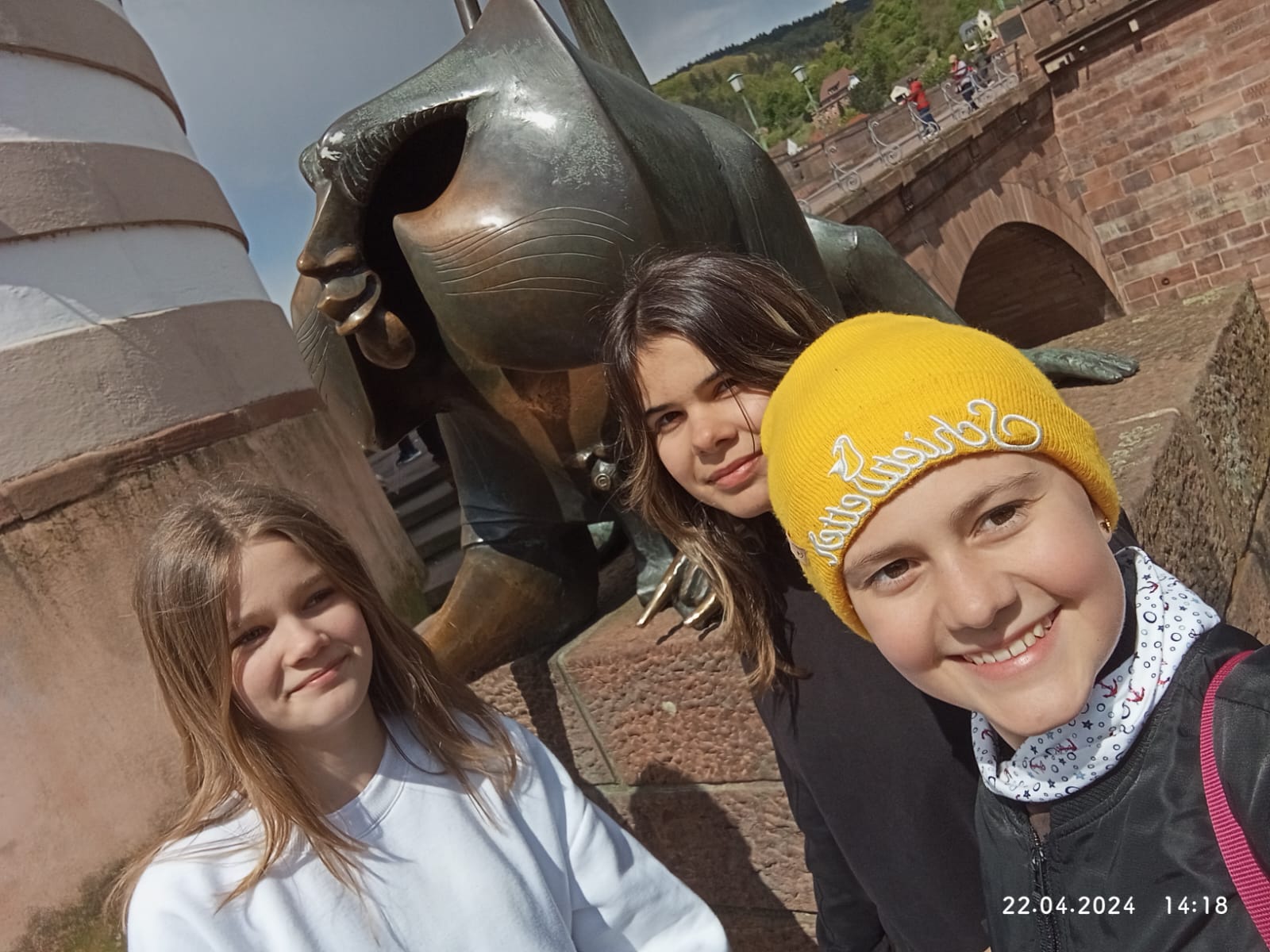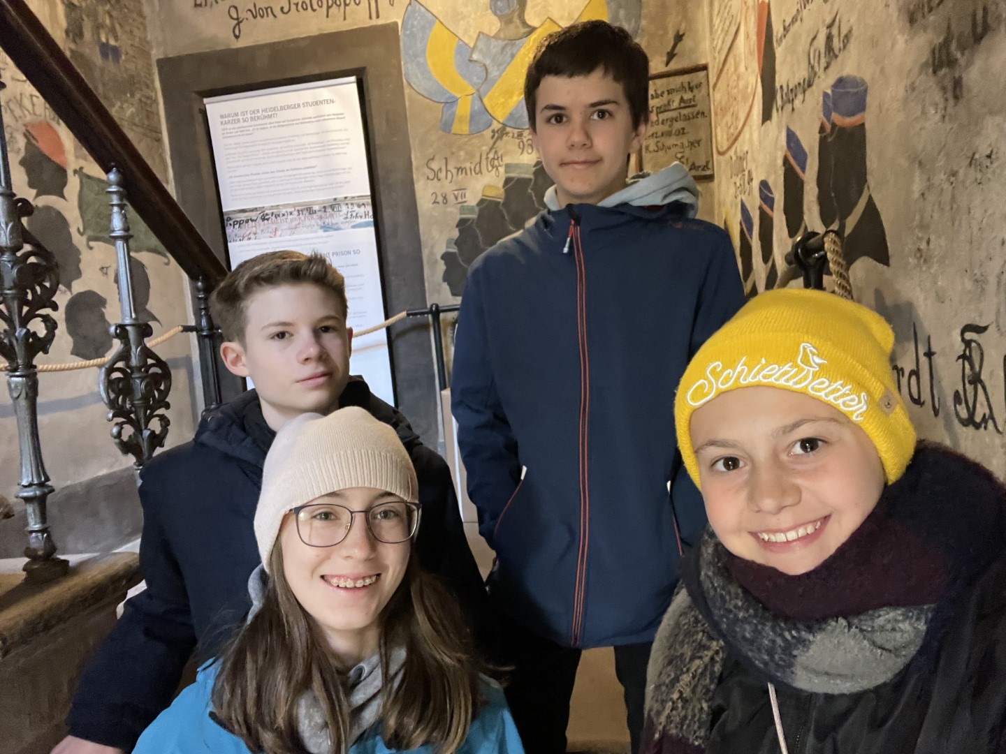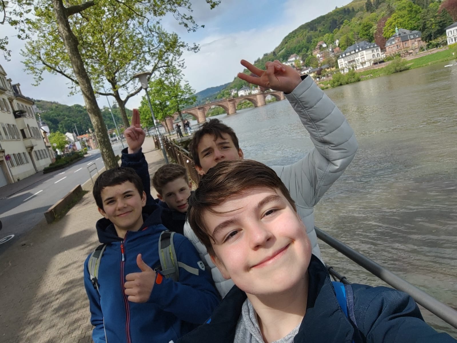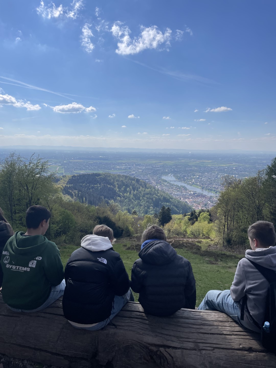 Am Ankunftstag, den 22.4.2024, fuhren die Klassen RS 7A und B mit ihren Klassenlehrerinnen Frau Schöner und Frau Graf-Wieler sowie mit Herrn Wojnowski nach Heidelberg und brachen gleich in die Altstadt auf. Dort durften die Schüler*innen erstmalig alleine die Altstadt kennen lernen. Um 14:00 Uhr versammelten sich die Klassen mit den Lehrerinnen und dem Lehrer auf dem Universitätsplatz. Dort haben wir dann Blätter mit Stadtplänen und Aufgaben ausgeteilt bekommen. Danach sind alle losgelaufen und haben die Sehenswürdigkeiten in der Heidelberger Altstadt gesucht. Hierfür mussten die Gruppen immer Selfies mit den Sehenswürdigkeiten an die Lehrer:innen schicken. Als wir alle elf Stationen gefunden hatten, trafen wir uns am Fuße des Schlangenwegs, um dort gemeinsam auf den Philosophenweg zu wandern. Das Gewinner-Team bekam eine Überraschung. Diese war eine Packung mit Studentenküssen: Das ist eine bekannte, handgemachte Praline aus Heidelberg. Anschließend wanderten wir noch auf die sogenannte Thinkstätte auf den Heiligenberg, der gegenüber vom Schloss liegt. Die Thinkstätte ist ein ehemaliges, Open Air Theater im antiken-römischen Stil, das von den Nationalsozialisten erbaut worden ist. Hier konnten wir auf die alten Gebäude klettern und uns Wettrennen über die Stufen hinweg liefern. Abends haben wir dann einen Spieleabend in der Lobby der Unterkunft gemacht.