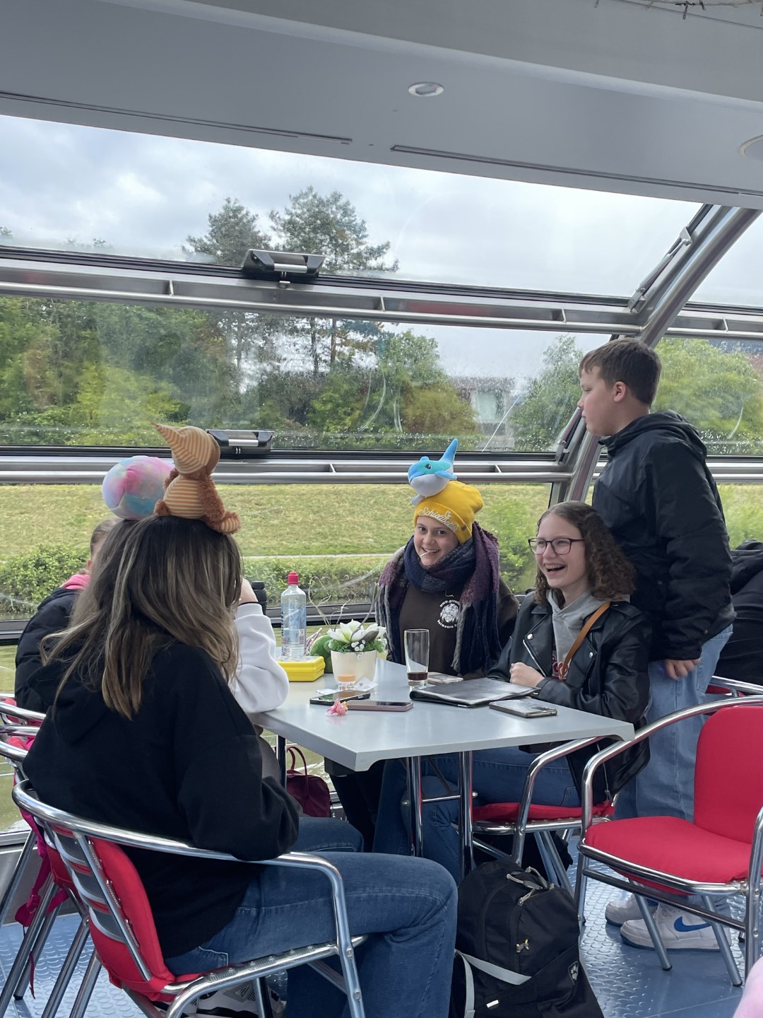 Danach hatten wir noch mal etwas Freizeit und konnten zum Beispiel Souvenirs erwerben. Am Ende unserer Klassenfahrt hatten wir noch eine Schifffahrt über den Neckar mit einem Solarschiff, der Neckarsonne. Dies ist also sehr nachhaltig. Die Fahrt hat ungefähr 50 Minuten gedauert und während der Fahrt wurde uns viel über die Geschichte der Stadt Heidelberg erzählt, das Schiff wird mit einem E-Motor angetrieben und durch die Solarpaneel auf dem Dach bekommt es genug Energie. Wir brachten alle unsere Kuscheltiere mit, die wir auf die Fahrt mitnehmen sollten: Statt eines klassischen Gruppenfotos gab es dann eines unserer Plüschtiere auf dem Schiff 🙂