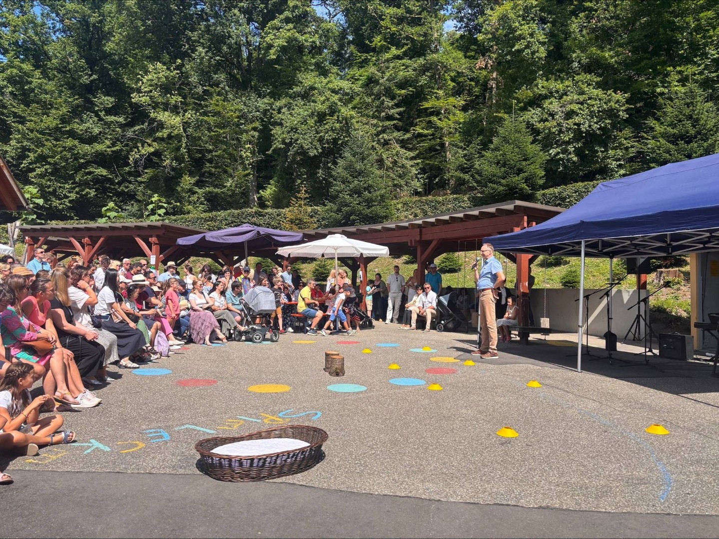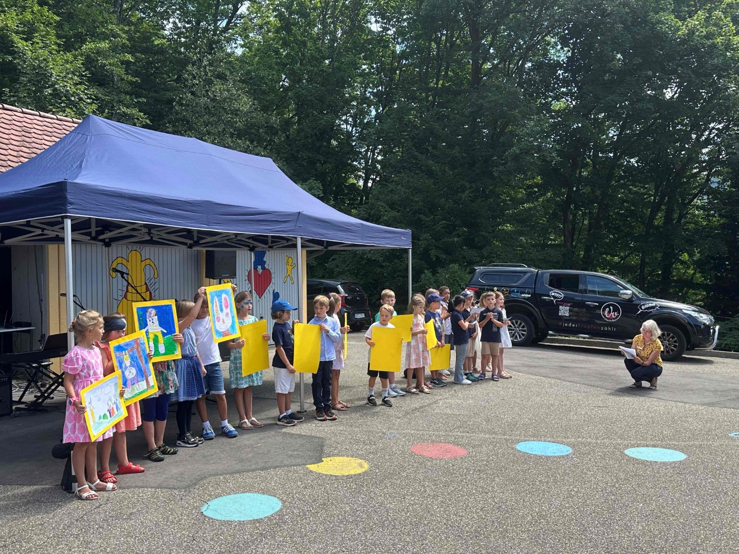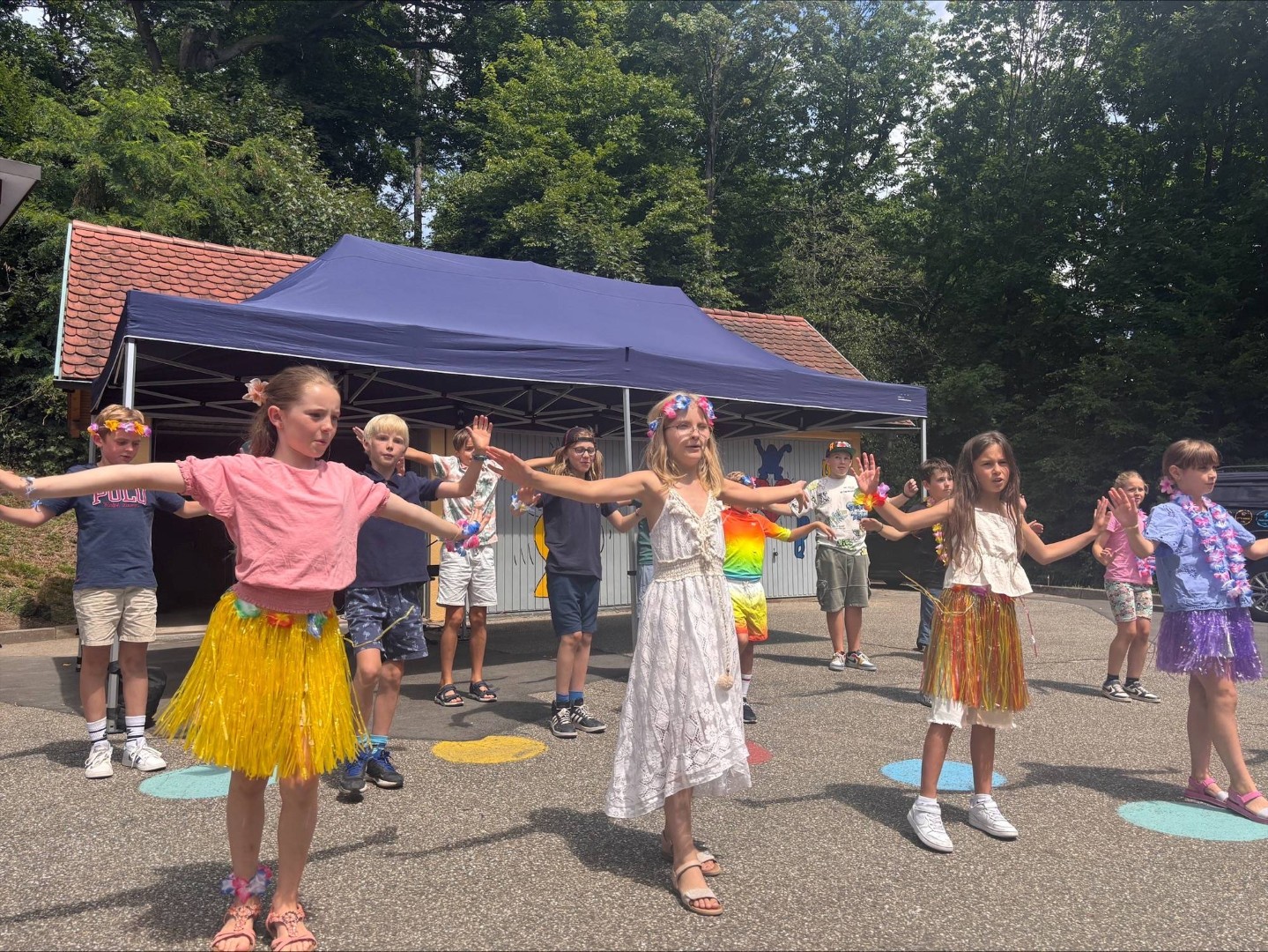 Auf der Schulhof-Bühne fand ein kurzweiliges und unterhaltsames Programm statt. Es wurden verschiedene Tänze und eine Bildergeschichte präsentiert. Der Kindergarten bereicherte die Darbietungen mit einer Mischung aus Tanz und Theater zum Regenbogenfisch, Grüffelo oder der Vogelhochzeit.