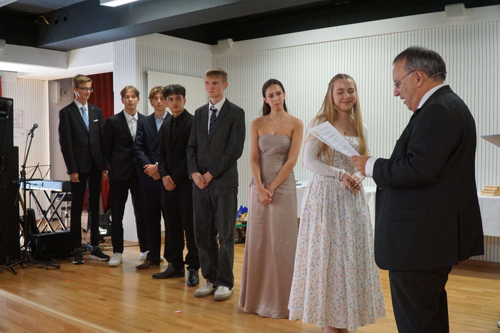 Die anschließende Lehrerrede von Milena Feirle war zugleich nachdenklich und motivierend. „Was soll man sagen, wenn ein ganzer Jahrgang geht? Vielleicht braucht es keine großen Worte, sondern nur die richtigen.“ Die Rednerin verglich die Schulzeit mit einer Sportlerkarriere, in der Lehrer als Trainer fungieren: Training lohnt sich, Pausen dürfen kurz sein, und Scheitern sei kein Makel – Stillstand dagegen schon. Der Jahrgang habe gemeinsam das Ziel erreicht, nicht immer im Gleichschritt, aber als Gemeinschaft. Das zähle mehr als jede Medaille.