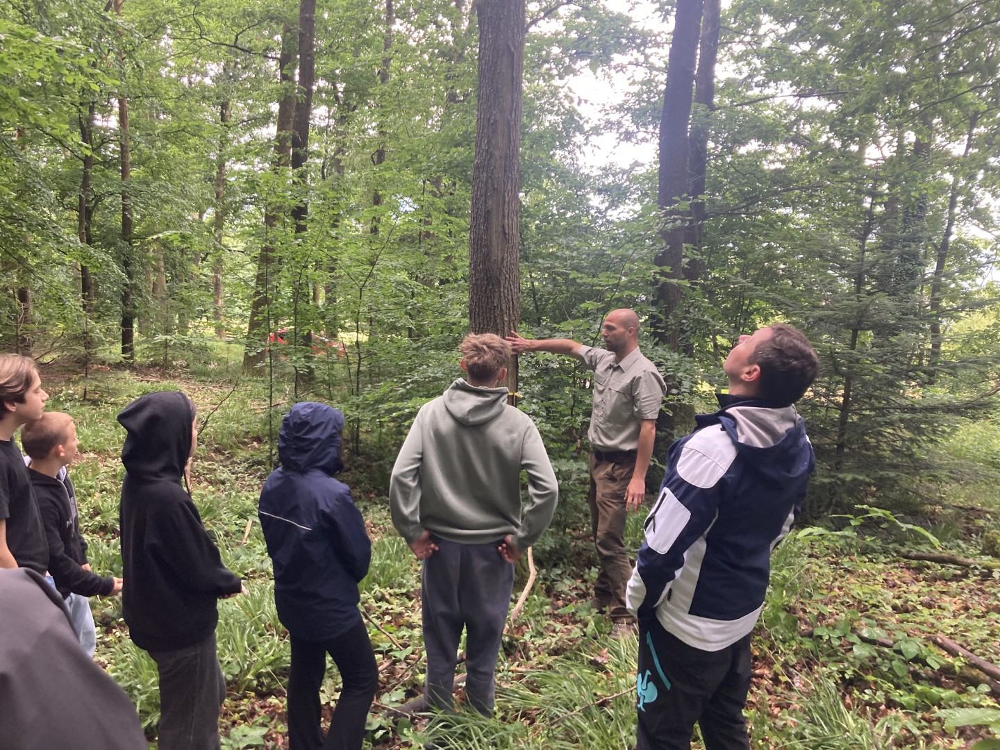 Kurz vor den Pfingstferien hatten wir hierfür dann einen echten Experten dabei: Forsttrainee Jannik Raible. Von ihm haben wir jede Menge über Forstwirtschaft gelernt. Zum Beispiel, dass es dabei nicht nur darum geht Holz zu erwirtschaften. Der Wald muss auch den nachfolgenden Generationen weiter zur Verfügung stehen. Spaziergänger, Mountainbiker und viele mehr wollen sich im Wald erholen. Und die Schutzfunktionen, die der Wald für uns hat, sowie seine Funktion als Lebensraum für Pflanzen und Tiere muss immer mit bedacht werden. Der Klimawandel spielt eine Rolle dabei, welche Bäume zukünftig in Wald noch wachsen können…ganz schön komplex alles.