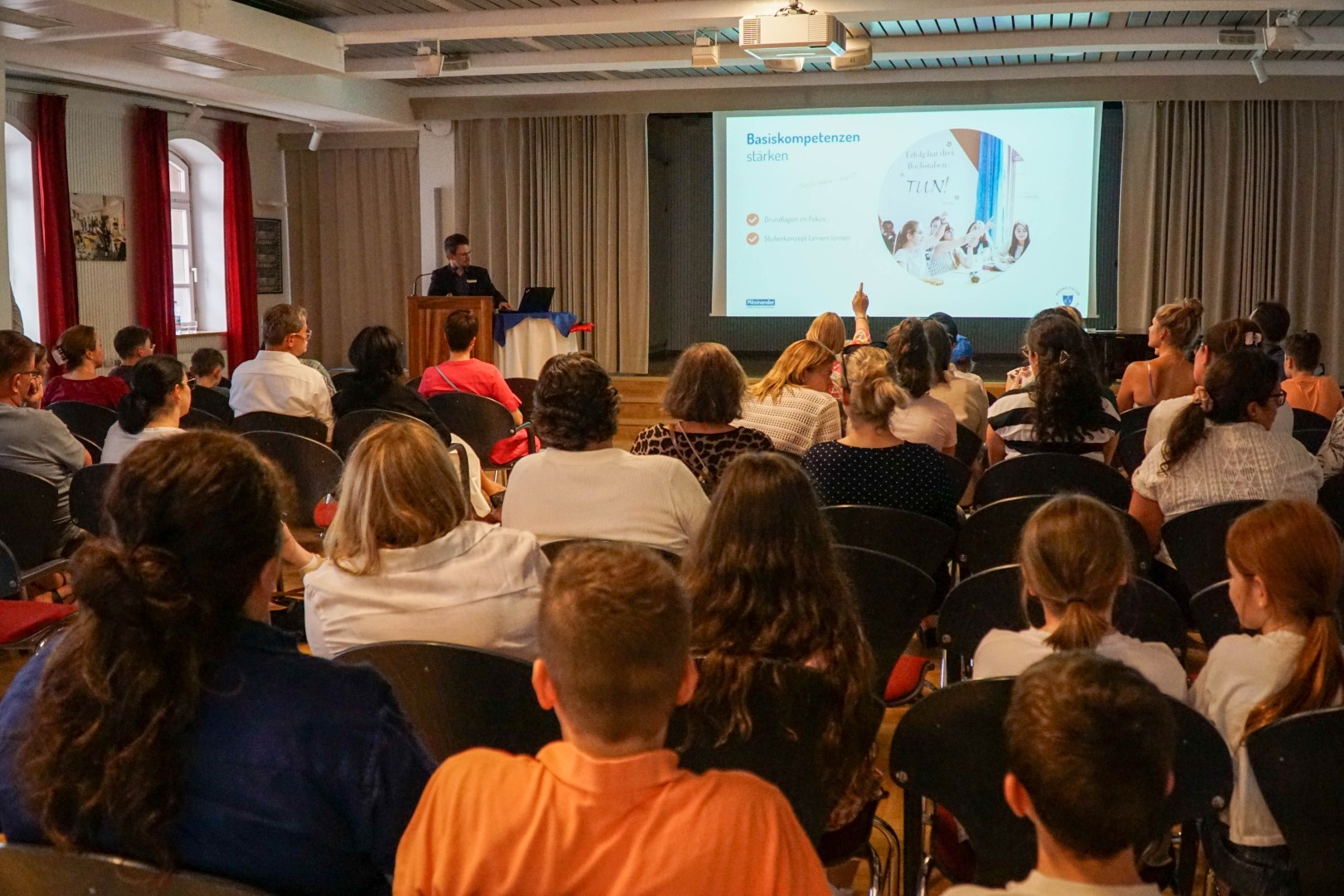Ab Klasse 7 gehören Hausaufgaben der Vergangenheit an. Was Schülerinnen und Schüler freut, Eltern zumeist verwundert, hat einen driftigen pädagogischen Grund: Hausaufgaben frustrieren, wenn im Unterricht nicht verstanden wurde, wie etwas zu bearbeiten ist. Die Folge ist, dass die Aufgaben nicht gemacht werden. “Das gibt es bei uns nicht”, so Alexander Büchler in seinem Vortrag in der Aula.