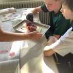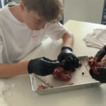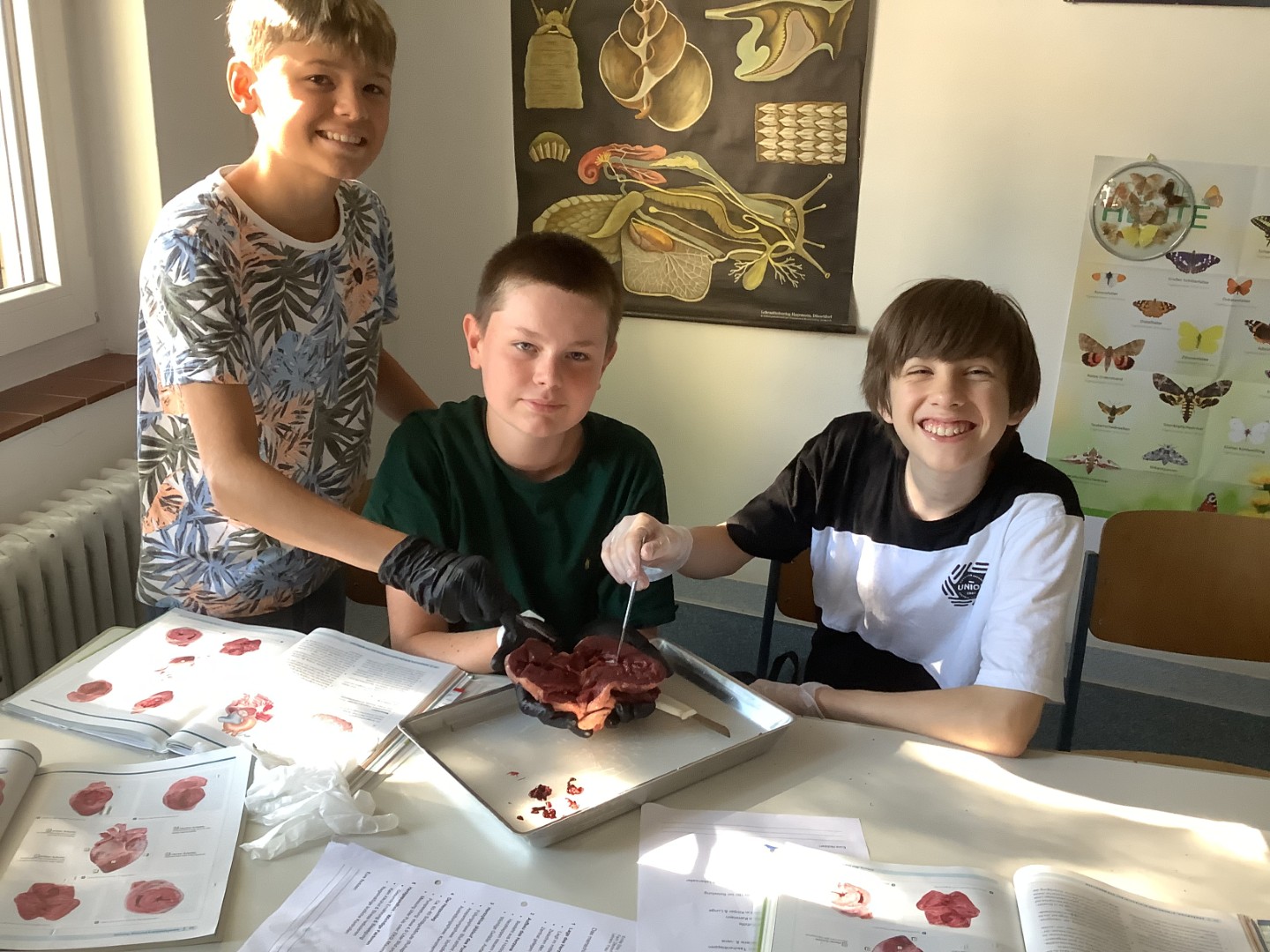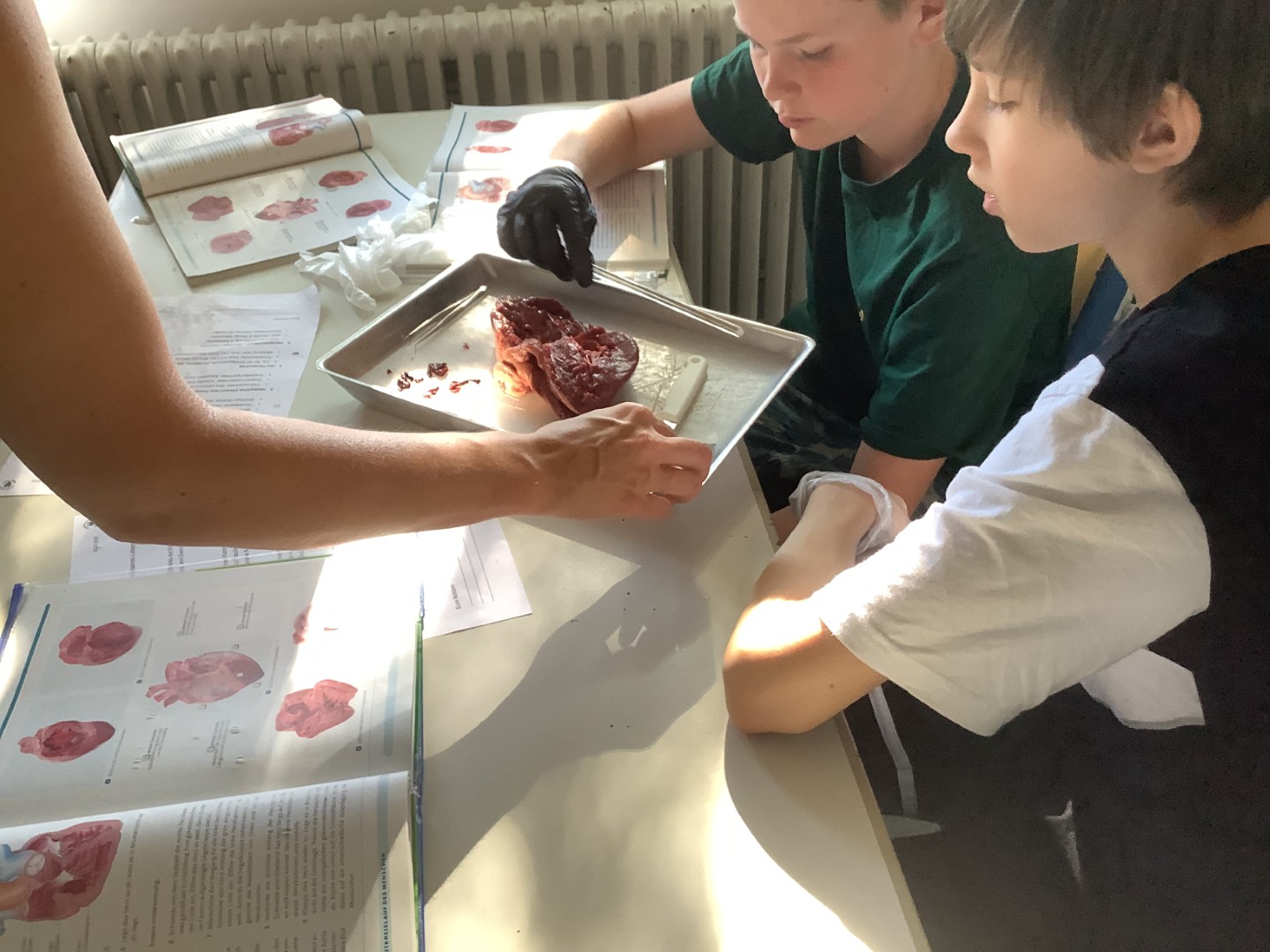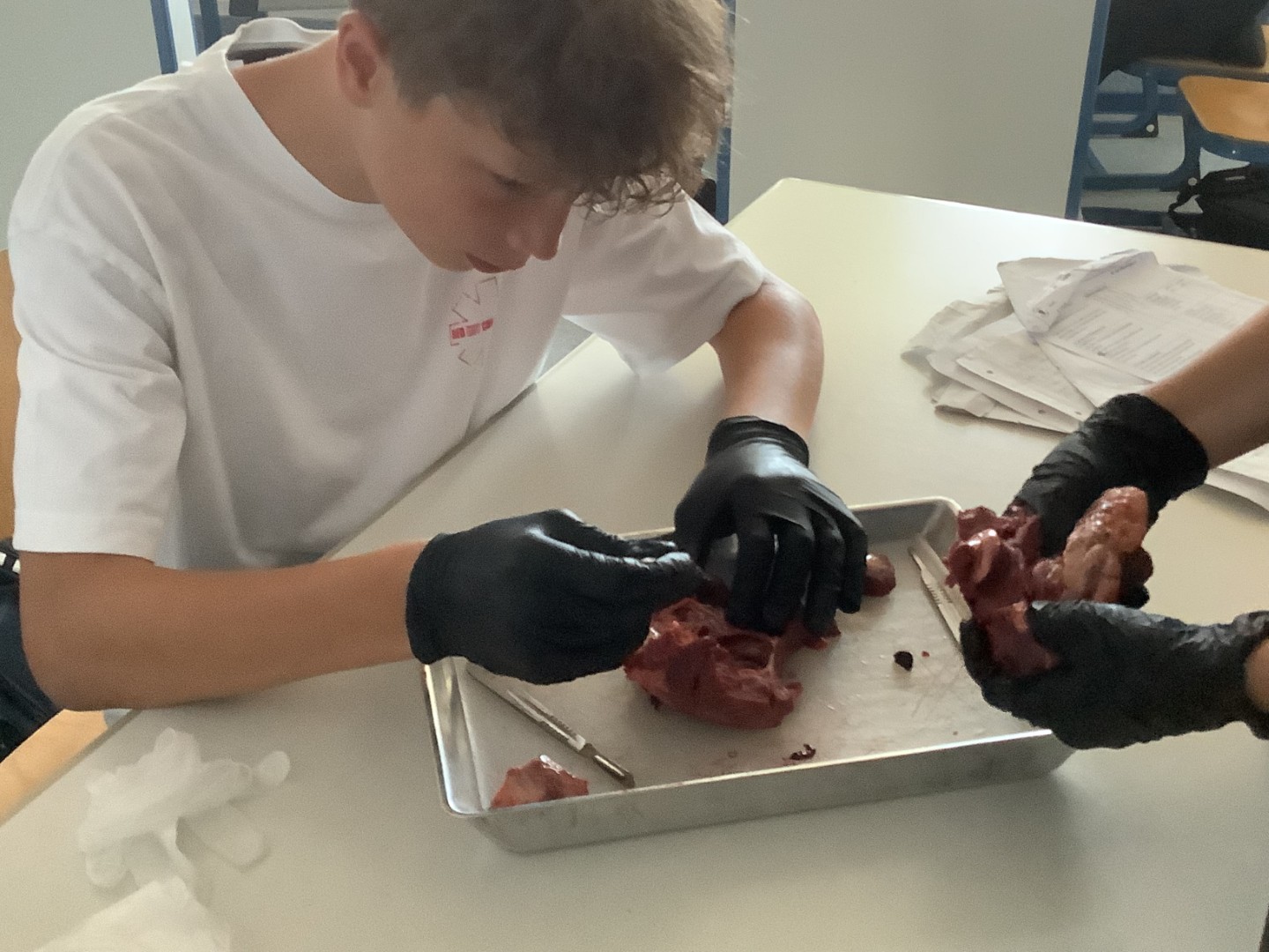 Die Klasse durfte zu Beginn mit Glasstäben den Weg des Blutes durch das Herz verfolgen. Anschließend wurden die Herzen in mehreren Schritten mit Skalpellen geöffnet. Im Inneren könnten dann die Vorhöfe, die Herzkammern, die Segel- und Taschenklappen, die Herzscheidewand und auch die unterschiedlichen Wanddicken entdeckt und betrachtet werden. Für die Schülerinnen und Schüler eine spannende Erfahrung!