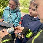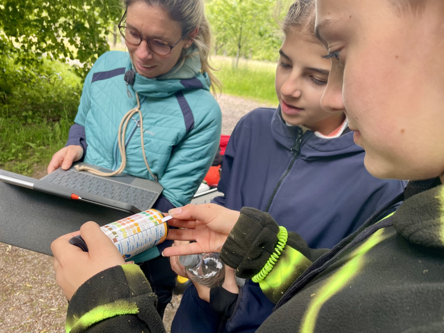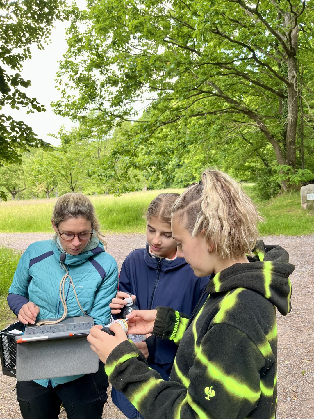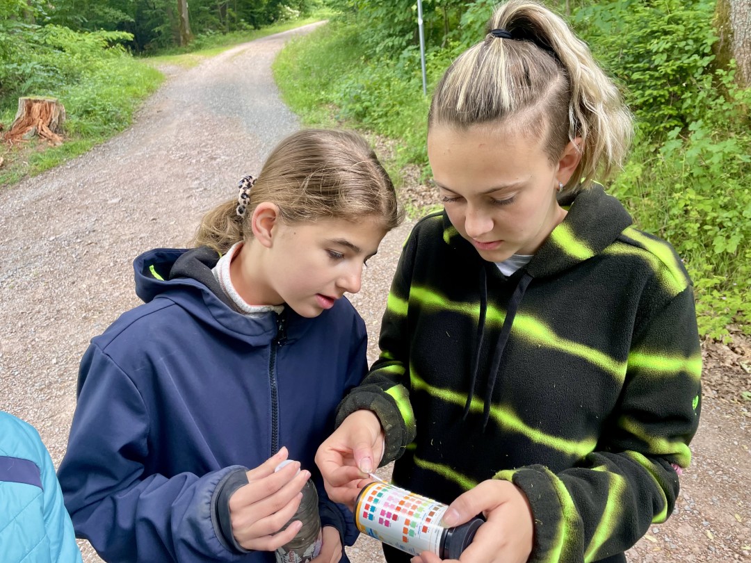 Nebenbei haben wir untersucht, wie es unserem Wald eigentlich so geht. Heute stand dabei der kleine Bach im Mittelpunkt, dessen Wasserqualität wir analysiert haben. Diese wollen wir, genau wie die Bodenqualität und verschiedene Klimadaten, über längere Zeit beobachten, um eine Bild davon zu bekommen, wie diese sich verändern und den Wald beeinflussen.