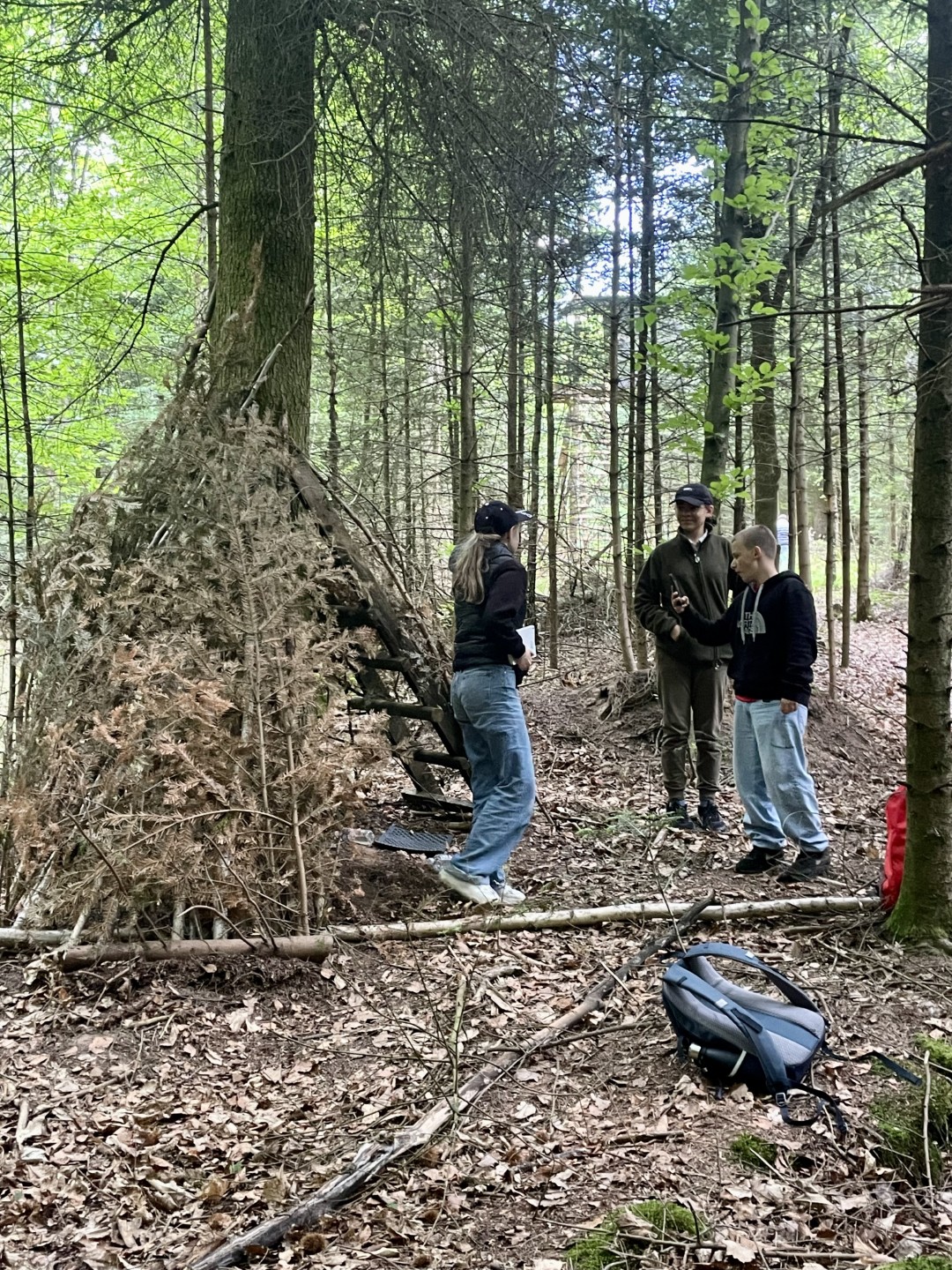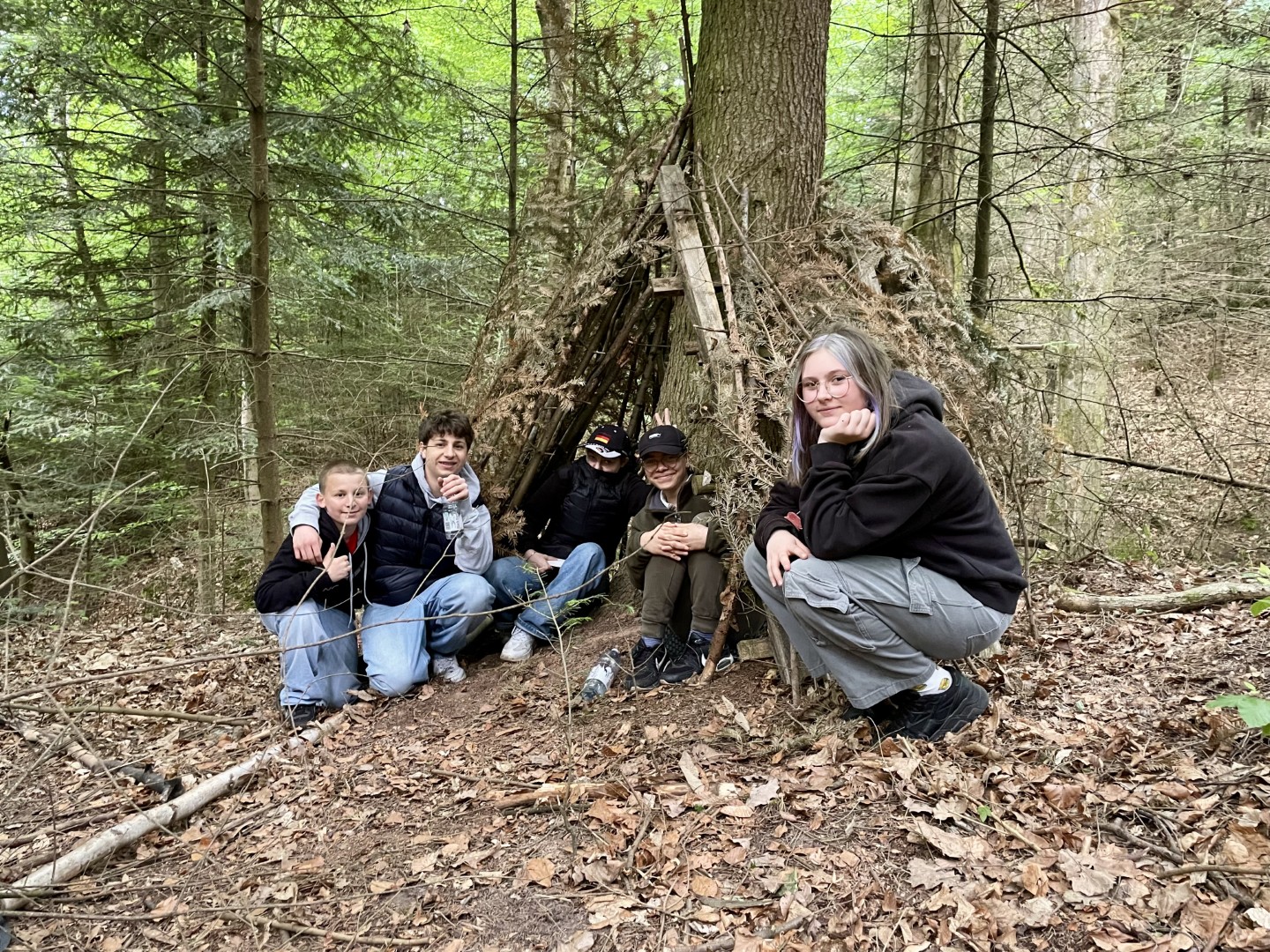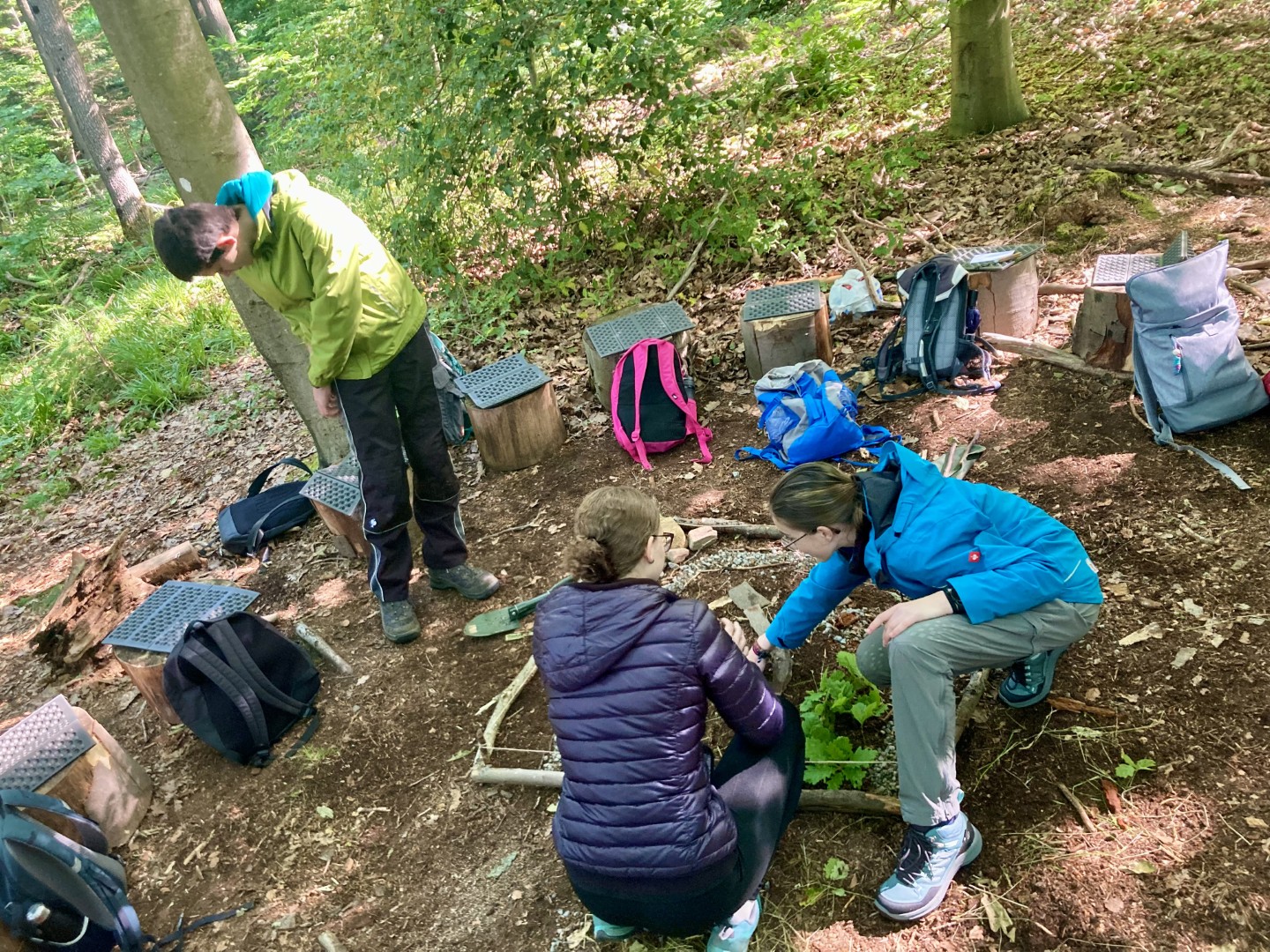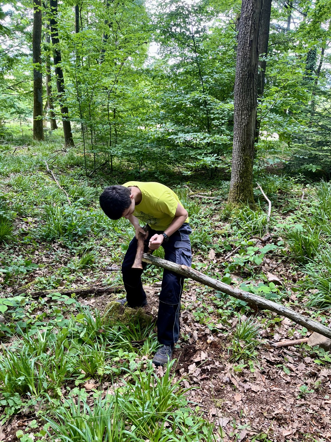 Anschließend stand für uns dann erstmal die Erholungsfunktion im Mittelpunkt. Zuerst bei einer kleinen Mittagspause. Anschließend haben die Schüler*innen kleine Waldhütten gebaut, in denen man es sich gemütlich machen kann. Der Stamm, der im letzten Jahr gefällten Buche, wurde außerdem so präpariert, dass wir ihn als Balancier-Parcours nutzen können.