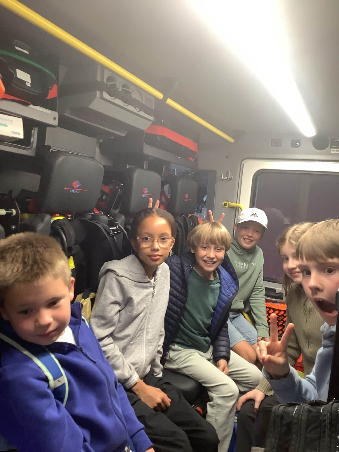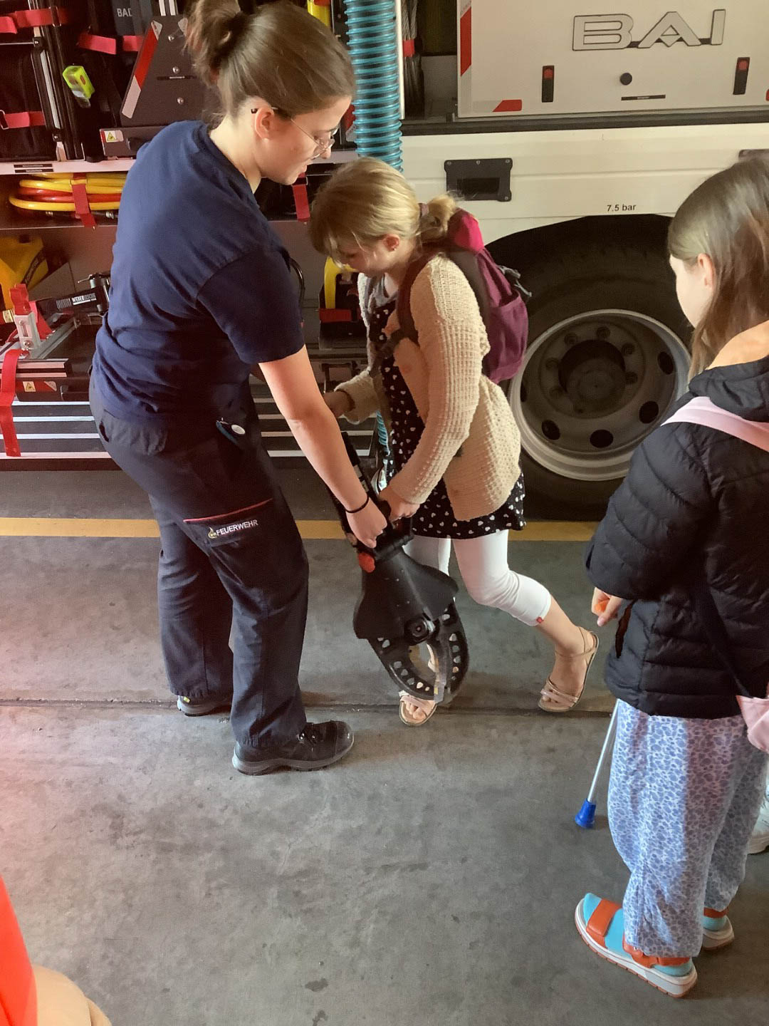 Anschließend wurden wir von Lena, der 17 Jährigen die gerade ihr Freiwilliges soziales Jahr dort macht, abgeholt. Sie machte mit uns eine Einweisung und die Kinder konnten ihr Vorwissen zeigen, bekamen neuen Input und gingen anschließend die Feuerwache ansehen. Die „Rutschstange“ war dabei ein großes Highlight für die Kids. Zur großes Bedeauerung erklärte Lena, dass diese erst ab 18 Jahre sei. Danach durften wir die Feuerwehrautos besichtigen. Immer zu sechst stiegen wir in ein Auto und Lena erklärte uns alles.