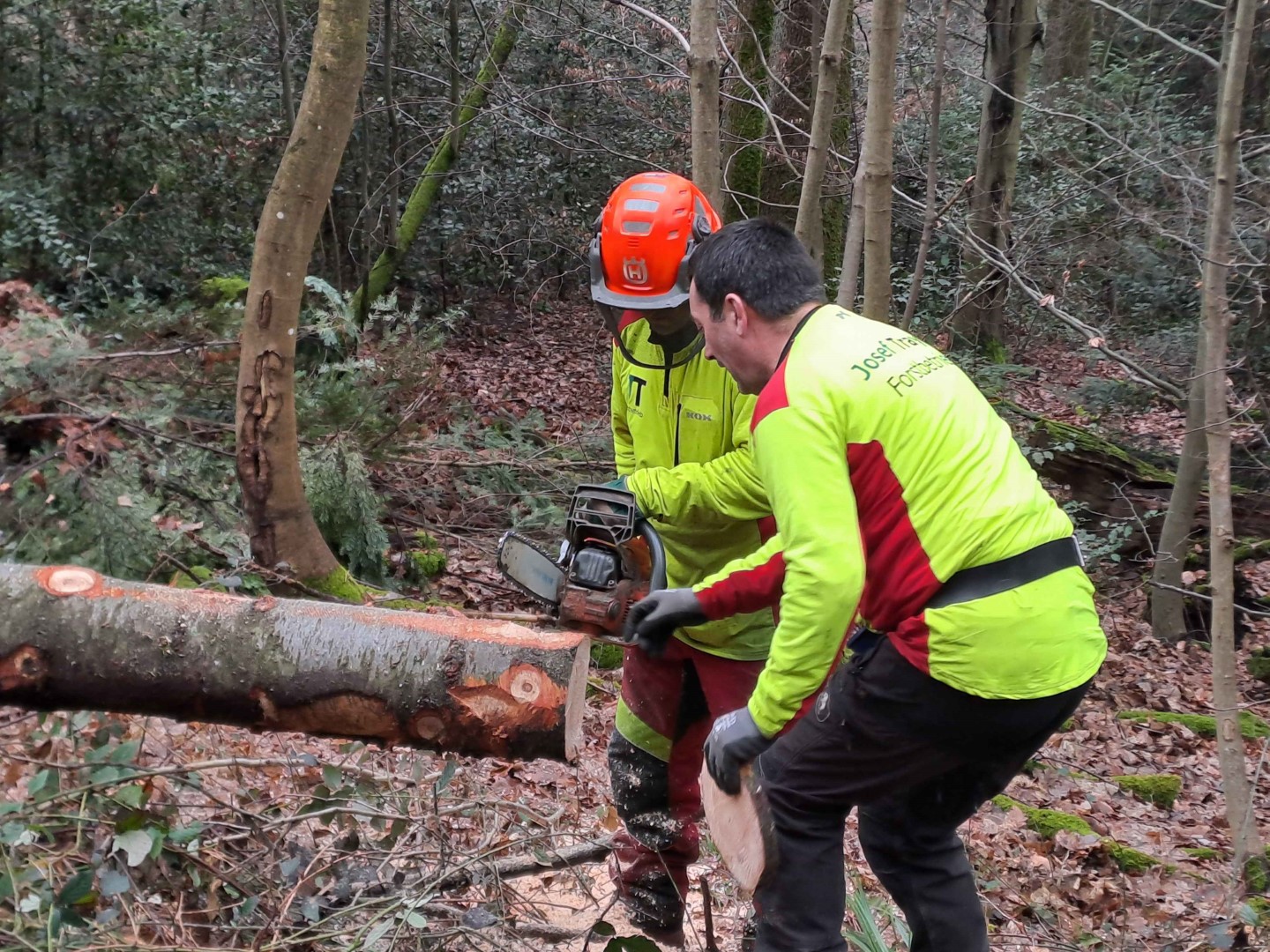 Zunächst wurden alle mit Helmen ausgestattet. Frau Krämer, eine Waldpädagogin vom Forstamt Baden-Baden stellte uns die Waldarbeiter mit ihren unterschiedlichen Berufen und Tätigkeiten vor. Als erstes lernten wir den Förster kennen. Er hat uns erklärt, warum die Bäume gefällt werden, was die Zeichen an den Bäumen bedeuten und wie die Ausrüstung der Waldarbeiter aussieht. Da Holzfäller ein sehr gefährlicher Beruf ist, braucht man dazu einen Helm mit Visier, Schnittschutzhosen, Arbeitshandschuhe und Schuhe mit Stahlkappen, einen Gürtel an dem unterschiedliche Sachen wie Kreide, Sprühfarbe, Maßband hängen können.