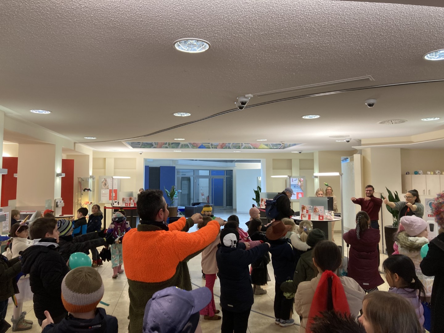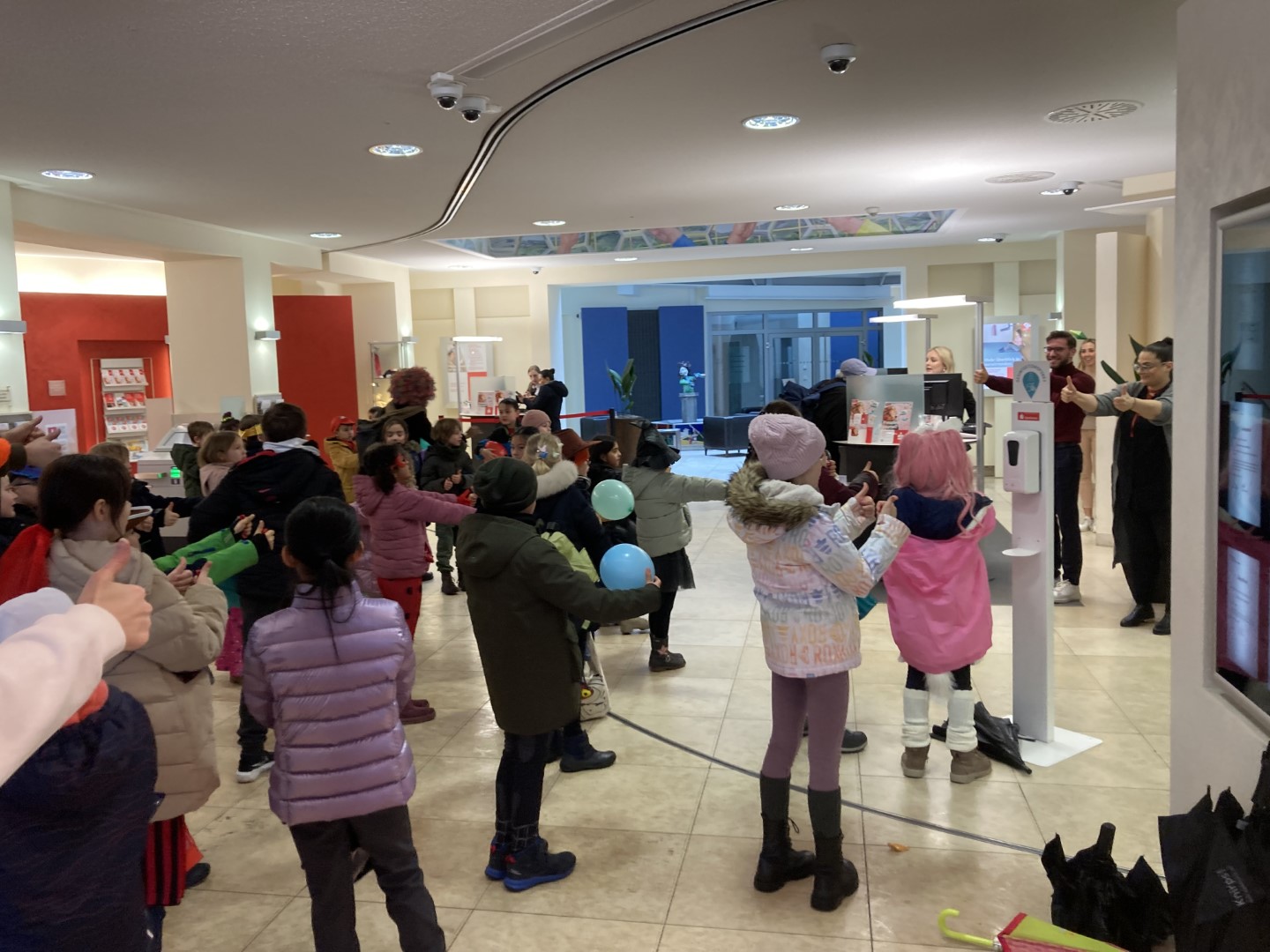 Mit drei Liedern, die im Vorfeld einstudiert wurden, brachten wir den Rathaussaal zum Beben. Die Narren sowie der Oberbürgermeister tanzten und sangen mit. Anschließend gab es noch eine kleine Stärkung ehe die SchülerInnen weiter in die Stadt zogen. Ein kleines Ständchen sangen wir noch in der Sparkasse bevor es für alle wieder nach oben an die Schule ging.